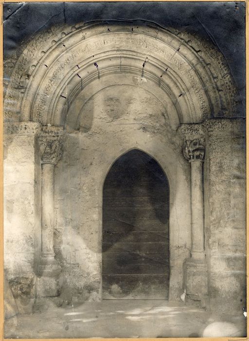 L'église s'ouvre par une porte de la première moitié du 12e siècle, beau spécimen des portes des édifices romans du sud-ouest. La porte se compose de deux colonnes posées en délit sous le premier arc d'archivolte avec chapiteaux historiés reposant sur des socles moulurés. Les tailloirs de ces chapiteaux sont sculptés et se poursuivent de part et d'autre, formant bandeau à la naissance et de la largeur de l'archivolte. Archivolte moulurée avec cordons sculptés et boutons. La baie primitive a été bouchée au nu du premier arc, faisant disparaître les tableaux des piédroits et le corbeau recevant le premier arc. Une porte fermée par un arc en tiers point a été ménagée dans le bouchement de cette baie.