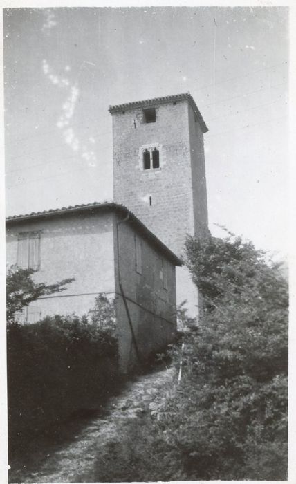 Ce clocher est le dernier vestige du premier château qui fut construitsà Lahitte et qui fut presque détruit par les guerres de Religion. Une église y fut accolée vers 1860. L'ouvrage présente un plan carré. Les fondations reposent sur un escarpement rocheux. Deux portes furent percées au pied de la tour pour permettre l'accès à l'église. Pour assurer plus de stabilité, la tour fut décapitée de quatre mètres. Deux ouvertures sont encadrées de pierres blanches sculptées, et géminées.