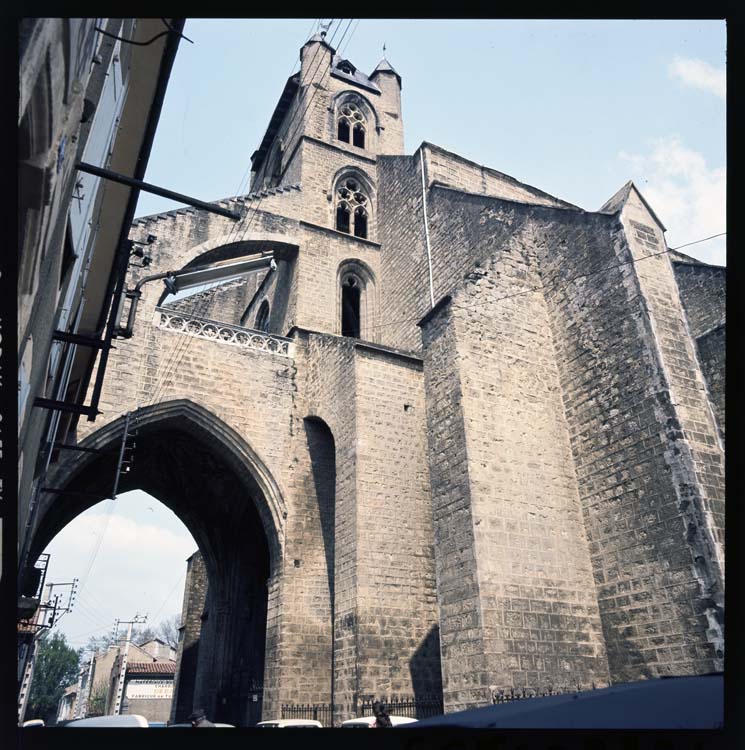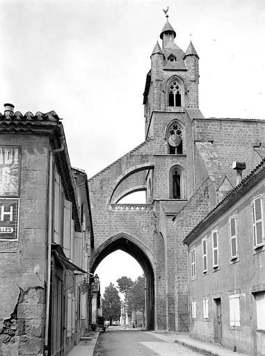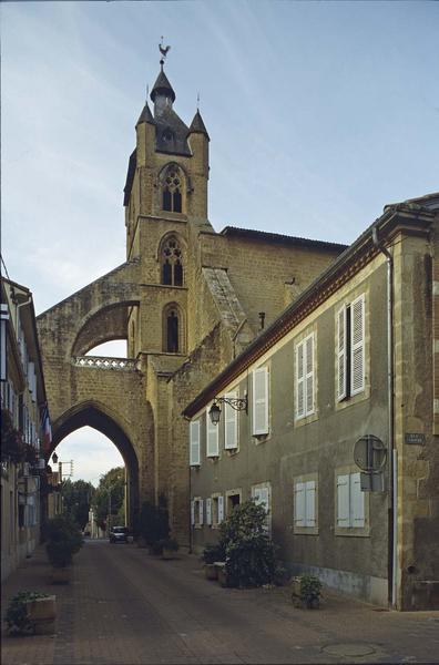 Construite à la fin du 14e siècle et au début du 15e, l'église se compose d'une nef de cinq travées, flanquée de bas-côtés aménagés en chapelles, et se termine par une abside polygonale. A l'ouest, au-dessus d'un double porche, s'élève un clocher dont les contreforts et la tourelle d'escalier sont couronnés par des clochetons. Le clocher est soutenu par des arcs-boutants passant au-dessus de la rue. L'escalier adossé à l'abside donne accès à la terrasse qui était aménagée pour la défense et qui communiquait avec les combles du vaisseau principal par un escalier extérieur en encorbellement.