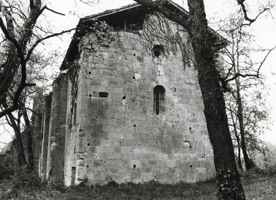 Edifice roman élevé à l'emplacement d'un domaine antique, mentionné pour la première fois vers 1096-118. Il fut probablement mutilé par Montgomery en 1569. A la Révolution, destruction du toit et du clocher. La nef rectangulaire se termine par un chevet plat. A l'angle sud-ouest se trouve l'escalier à vis du clocher, de plan carré. La porte s'ouvre au sud sous un arc plein cintre à triple voussures. Dans le tympan supporté par un linteau monolithe sans décor est inséré un chrisme, remploi probable.