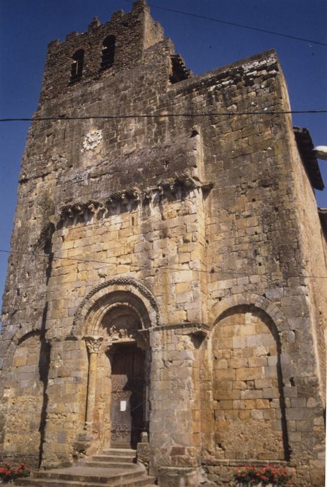 Eglise édifiée à partir des restes d'une abbaye bénédictine dont les archives révèlent peu de renseignements. Dévastée vers 1260 et reconstruite aux alentours de 1290, elle fut pillée durant les guerres de religion et saccagée pendant la Révolution. L'église actuelle présente une nef de belle proportion, terminée par un tympan roman. Le chevet a été aménagé aux 17e et 19e siècles. La partie occidentale est ornée d'un très beau tympan : Christ dominant les quatre symboles des Evangélistes et encadré de personnages nimbés le soutenant. Le clocher carré date de 1745.