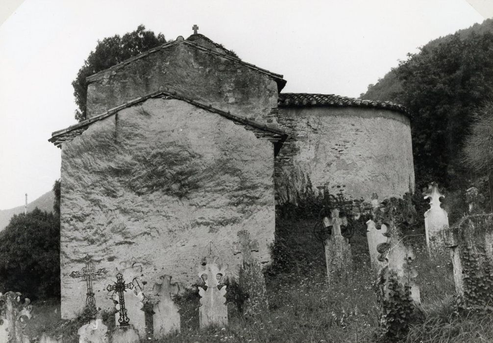 L'ancienne église est aujourd'hui utilisée comme chapelle de dévotion. Croix sur le mur d'enceinte du cimetière.