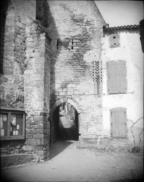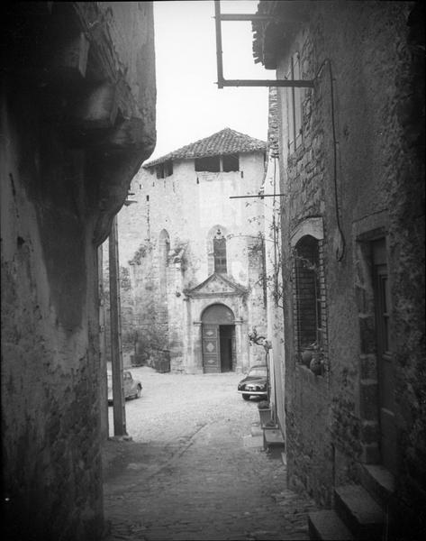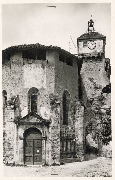L'église, qui s'ouvrait à la place du choeur actuel, a subi plusieurs modifications depuis son origine. Elle faisait partie de l'ancienne enceinte du bourg, avec chemin de ronde et créneaux à mâchicoulis. La disposition actuelle date de l'extension du village. Certaines sculptures incorporées dans le mur latéral extérieur, semblent dater du 13e siècle mais proviennent certainement du château, ainsi que le chapiteau à volutes transformé en bénitier. L'édifice se compose d'une nef unique de trois travées avec voûte d'ogive. Du côté de l'ancienne entrée se trouve un choeur voûté en cul de four, précédé d'un arc doubleau et, du côté de l'entrée actuelle, se trouve l'ancien chevet à pans coupés. Les peintures sur les voûtes rappellent celles de la cathédrale d'Albi. Le beffroi, appelé Porte du Pont, est placé à droite de l'église. Son escalier d'accès est situé le long de la façade latérale de l'église.