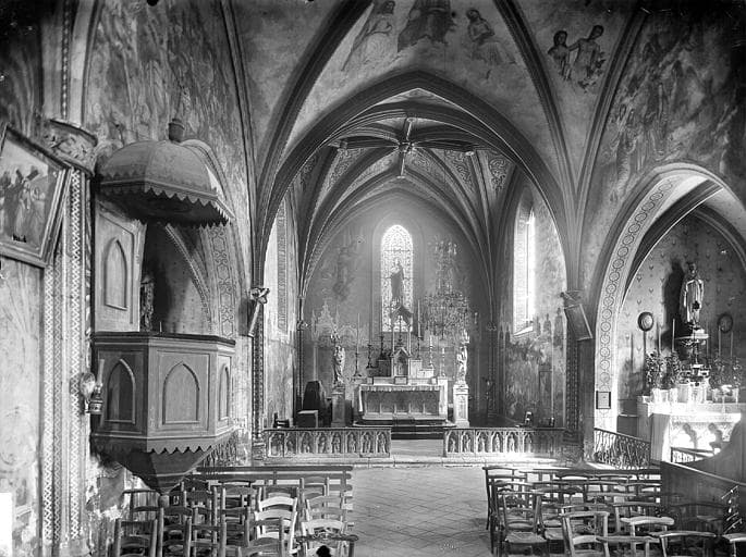 Eglise du 15e siècle, dominée par un clocher-mur à cinq arcades du 19e siècle. Décor peint du 19e siècle.