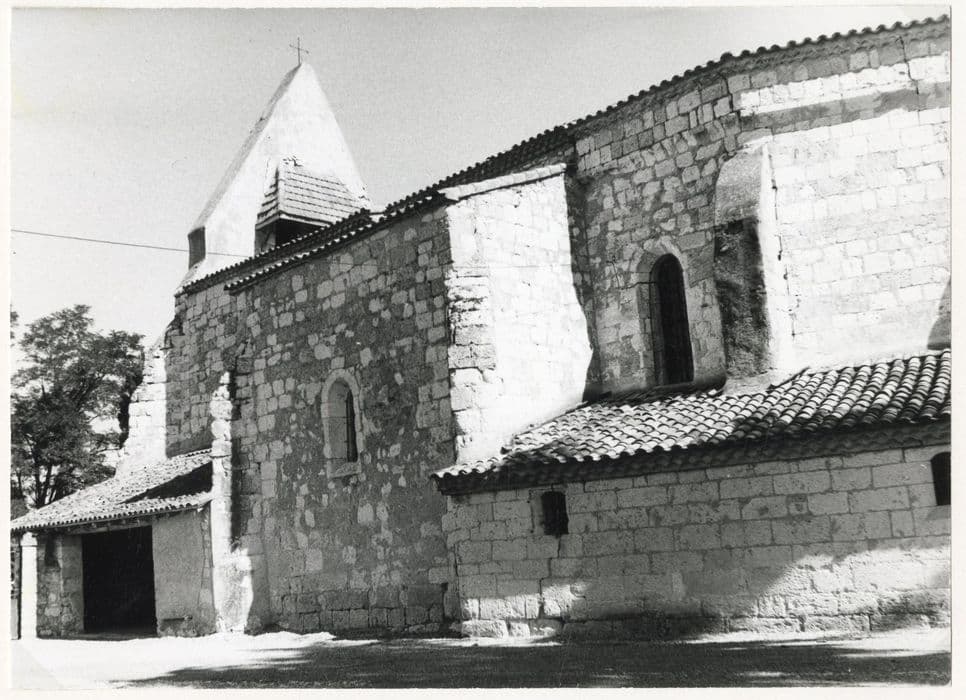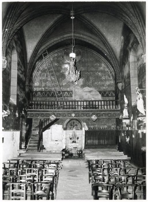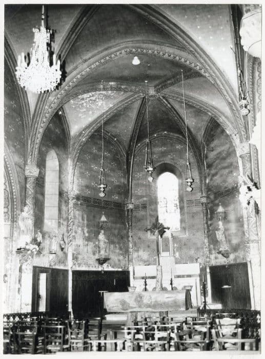 Voûtes de la nef reconstituées dans la seconde moitié du 19e siècle. La troisième travée a été refaite au 19e siècle et voûtée en berceau. Avant la construction de la voûte de la nef au 19e siècle, la nef, plus haute que le choeur, était couverte d'un lambris. Choeur pentagonal couvert d'ogives filetées et évidées ; chapiteaux ornés des symboles des Evangélistes. Clocher-mur triangulaire ajouré de deux arcades en plein cintre, datant peut-être du 17e siècle. Portail tracé en tiers point entouré d'un boudin ininterrompu. Au-dessus de l'auvent, les pierres saillantes servirent peut-être de support à un mâchicoulis. Au chevet, modillons qui proviennent de l'église romane précédente.