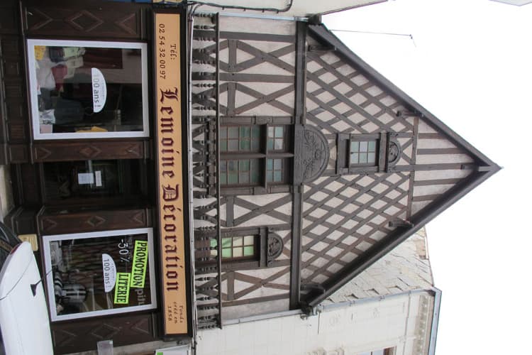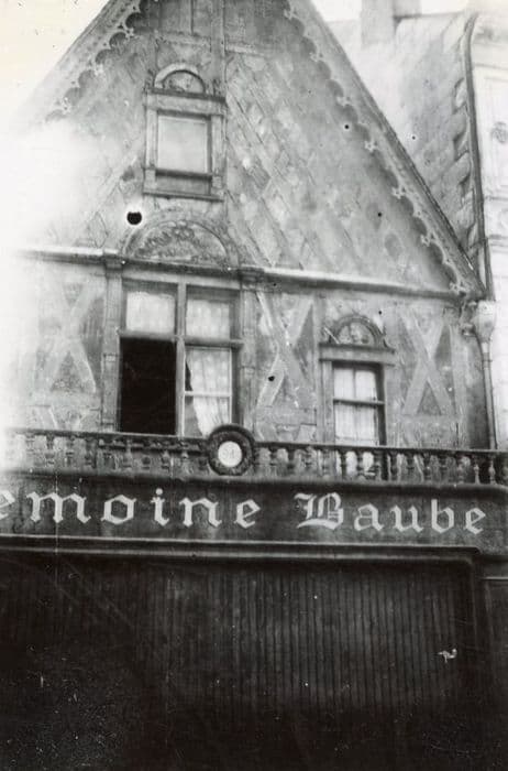 A partir du premier étage, la façade est en pans de bois, à croix de Saint-André et croisillons, remplissage enduit. Elle est percée de deux fenêtres à meneaux en bois. La principale est ornée de chaque côté de pilastres à chapiteaux surmontés d'un fronton demi-circulaire en bois sculpté. A sa droite, l'autre fenêtre offre la même disposition, mais l'encadrement entier est sculpté et le fronton est orné d'un médaillon avec tête d'homme. Même disposition à la fenêtre qui se trouve dans le pignon. La façade est ornée d'un balcon à balustres en bois, décoré dans sa partie centrale d'une couronne en bois sculpté encadrant une glace. Frise en bois découpé, moderne, le long du pignon. L'intérieur conserve un escalier à vis en bois avec rampe moulurée, dont l'accès se fait par une ouverture ornée de deux colonnes en pierre qui devait autrefois être l'entrée sur la façade postérieure.