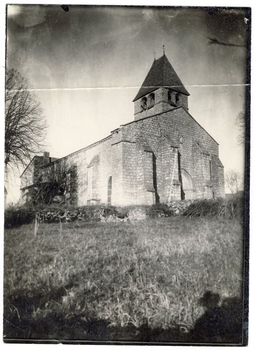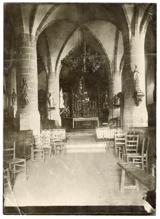 Le monument primitif du 13e sècle était rectangulaire. Un chevet plat terminait trois nefs de trois travées chacune, de plan barlong dans le sens de la longueur. Une quatrième travée de même dimension que les autres, était rétrécie au centre par une sorte de narthex intérieur supportant le clocher. En avant, un petit portail à trois rouleaux en arc brisé repose sur des colonnes dégagées à chapiteaux à crossettes et à figurines. Les colonnes engagées recevant les retombées des nervures des voûtes, ont des fûts à section en amande avec arête vive de face. Les trois travées du choeur et des nefs ont été détruites à la fin du 16e siècle par les Huguenots. L'église fut restaurée de 1624 à 1665, dans l'esprit du style gothique. Six grosses colonnes cylindriques remplacèrent les piles cruciformes du 13e siècle. Les nervures des voûtes, décorées d'un boudin avec arête vive de la fin du 13e siècle, ont été réemployées et raccordées sur les fûts mais, insuffisantes, elles alternent avec des nervures à simple section carrée. Les essais de restitution gothique au 16e siècle sont rares, et celui-ci est un des exemples les plus intéressants.