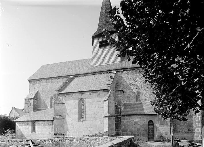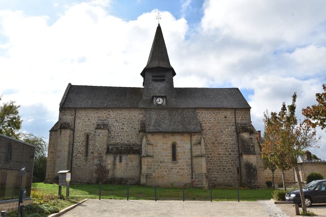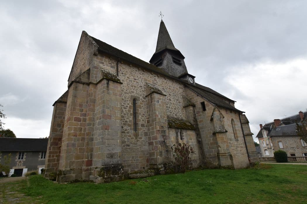 Eglise du 13e siècle, à une seule nef de quatre travées. Voûtes en maçonnerie à arêtiers de granit, ainsi que les formerets et les doubleaux. Dans les trois premières travées, les doubleaux reposent sur des colonnes qui s'interrompent avant le sol et reposent sur des culs de lampes sculptés. Sur la seconde travée s'ouvrent des chapelles voûtées. Les colonnes de la chapelle de droite se terminent par des bases sculptées. L'entrée de l'église est précédée par un porche limousin.