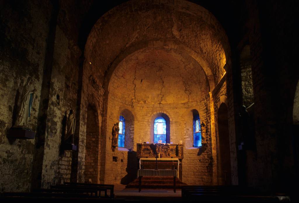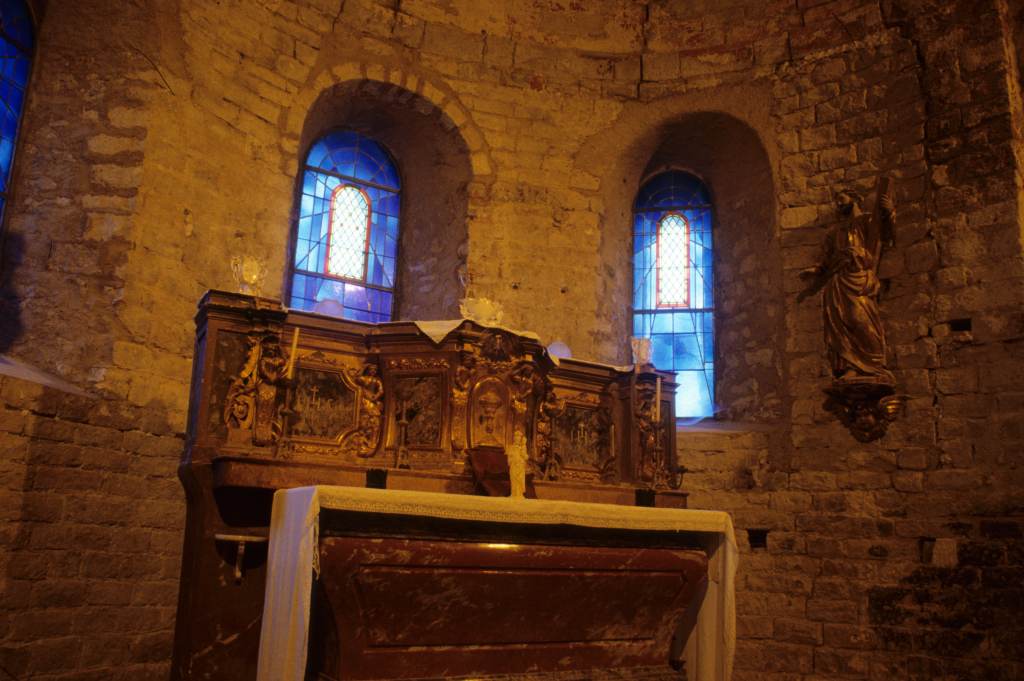 Eglise romane fortifiée qui servit de lieu de repli aux habitants pendant les guerres de Religion. C'est une église du 12e siècle, avec nef voûtée en berceau, abside demi-circulaire voûtée en cul de four et embryons de transepts constitués à l'extérieur par deux décrochements présentant à l'intérieur deux petites absidioles. L'édifice a probablement été fortifiée au 14e siècle. La courtine a été élevée sur la couverture en lauzes à l'aplomb extérieur du mur. Elle fut ensuite dérasée au niveau voulu pour l'établissement de la couverture actuelle en tuiles creuses. Au sud, la porte d'entrée comporte un gros linteau et un tympan. Le clocher devait être à l'origine un simple pignon à arcature, à l'ouest. Sans doute au 14e siècle, d'apèrs l'appareil, un clocher fut élevé sur ce pignon et sur les murs gouttereaux de la nef correspondant à la dernière travée. Ce clocher a dû être endommagé par l'incendie d'une grange qui était accolée à l'église, au moment des guerres de Religion, en 1580.