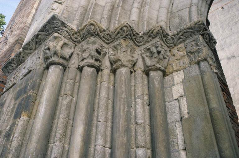 D'après une inscription placée au-dessus de l'archivolte, l'église aurait été bâtie en 1162. Devenue trop étroite pour la population, elle fut remplacée par une église plus vaste en 1321, laquelle fit disparaître le choeur roman, et qui resta elle-même inachevée et dépourvue de voûtes. Au 16e siècle, la nef romane devint la chapelle Saint-Michel. Le portail est surmonté d'un clocher en briques percé d'arcades. Il sert de passage et n'est garni d'aucun vantail. C'est l'un des éléments de l'ancienne église romane. Il présente des colonnettes ainsi qu'une frise à hauteur des chapiteaux. L'église du 14e siècle est couverte de voûtes modernes : les piliers sont seuls en pierre de taille ainsi que les chapiteaux, le reste est en briques. La chapelle du Saint-Sépulcre est adossée au choeur. C'est une adjonction au plan primitif qui peut être datée de la fin du 15e siècle. Elle aurait été construite par la famille de Claverie qui y aurait eu sa sépulture. Elle est couverte par une voûte à liernes et tiercerons, ornée de peintures en grisaille de la fin du 18e siècle, recouvrant peut-être un décor Renaissance. La grille en fer forgé qui la ferme date du 15e siècle. A l'intérieur se trouvent un sépulcre qui se compose d'un autel en pierre avec moulurations du 15e siècle ; un saint sépulcre placé sous une arcature dont l'archivolte et les piédroits portent une gorge ornée de feuillages, sculpture du 15e siècle. L'autel supporte un tombeau entouré de sept personnages dont deux, sur les côtés, ensevelissent le corps du Christ. Le fond de l'arcature est orné de neuf petites figures d'anges en haut relief, portées par des nuages et tenant dans leurs mains les instruments de la Passion.