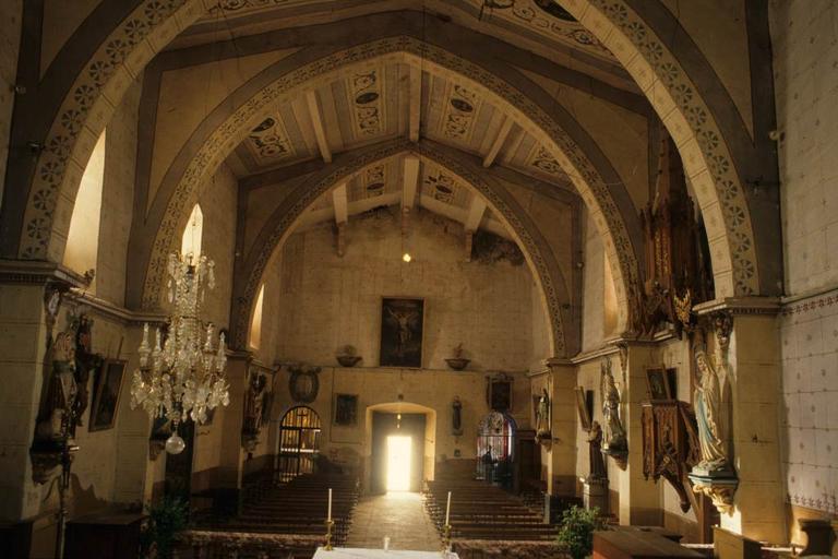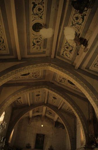 Eglise vraisemblablement construite au 17e siècle sur les structures d'un édifice antérieur. Au 19e siècle, un porche a été accolé à la façade occidentale et l'église reçut un décor peint particulièrement riche, notamment au-dessus de la nef et du choeur. L'édifice orienté se compose d'une nef unique, d'un choeur composé d'une travée et d'une abside semi-circulaire. L'entrée s'effectue à l'ouest, dans l'axe de la façade, par une porte rectangulaire à encadrements à refends. De part et d'autre du porche 19e siècle ont été ménagées deux chapelles, au fond de la nef. Au-dessus des portes plein cintre de ces deux chapelles et sur les murs gouttereaux de la nef ont été appliqués des cartouches en plâtre sommés d'une coquille et encadrant un médaillon ovale ourlé de guirlandes. A l'intérieur du médaillon figure une croix. L'abside est couverte d'une voûte en cul de four. Un décor architectural de pilastres ioniques couplés l'anime. Ces douze pilastres supportent une corniche au répertoire antiquisant, adapté au goût de l'époque (denticule, mutules, raies de choeur, acrotères...). Sur les murs de la nef sont représentés de faux lambris au-dessus desquels est figuré un faux appareil chargé, en son centre, d'un motif. Le plafond de la nef épouse les deux versants de la toiture. Il est orné de panneaux peints richement décorés de rinceaux qui encadrent des médaillons dans lesquels sont représentés les instruments de la Passion et autres symboles religieux. Le cul de four de l'abside est divisé en cinq panneaux historiés, ornés de rinceaux. L'ensemble du décor peint est traité dans un camaïeu de bleus, notamment dans l'abside.