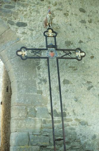 L'église fut consacrée par Dalmace, évêque de Narbonne, en 1088. Elle a été remplacée, probablement au 18e siècle, par une nouvelle église plus vaste, orientée sensiblement est-ouest. De l'ancien bâtiment est conservé le mur du fond qui supporte un clocher-mur, et une partie des murs latéraux, délimitant un vaste porche. Ces murs latéraux ont eux-mêmes été remontés en 1833, à la suite d'affaissements qui touchaient tout l'espace compris entre l'église et la terrasse du presbytère. La seule partie ancienne est donc le mur du clocher. Son élévation présente trois parties. A la base, jusqu'à mi-hauteur, le parement montre un appareil assez régulier, travaillé au marteau. Au-dessus, le mur a été surélevé, peut-être dans un dessein défensif, dans un appareil plus sommaire. Enfin, les arcades des cloches ont été construites en retrait, en moyen appareil, beaucoup plus tardivement. Le pignon supérieur est arrondi en forme de cloche. Il est peu probable que cette partie, qualifiée de romane, soit antérieure au 17e siècle. £Les fortifications sont mentionnées à partir de 1119. La porte fortifiée ne paraît pas être antérieure au 14e siècle. C'est une porte en arc brisé, constitué par 17 claveaux, dont une clef médiane. L'encadrement intérieur est chanfreiné. £La croix à proximité paraît dater de la Restauration. Socle carré, sans inscription, avec tablette moulurée. La croix est en fer forgé, constituée par deux fers qui se retournent pour former la traverse, sans s'entrecroiser à la croisée des bras. Cette partie est seulement entretoisée par des fers plus petits et par la torsade épineuse qui forme l'ornement central. Les extrémités sont trilobées. L'intérieur de ces trilobes est orné par des palmettes en tôle, avec volutes de base, esquissant une fleur de lys. Divers instruments de la Passion sont disposés entre les armatures : échelle, glaive, porte-éponge, tenailles, clous. Sur le haut de la croix est perché un coq en tôle.