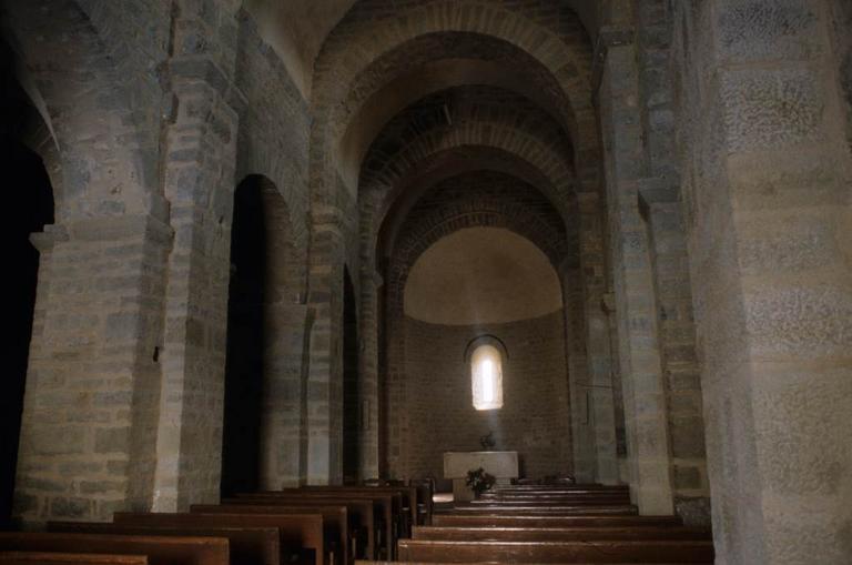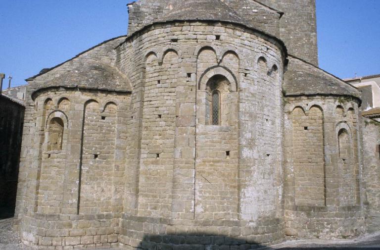 Eglise romane à trois absides et trois nefs, sans transept. Le clocher s'élève sur une travée du bas-côté nord. Son couronnement est moderne. Nef et bas-côtés voûtés d'arête. Les archivoltes des baies des absides et du clocher portent un filet de décoration en pierres noires. De fausses arcatures et des bandes formant contreforts peu saillants décorent les parements des absides. Des corbelets à tête grossière sont intercalés entre les bandes aux retombées des fausses arcatures. La porte de la façade ouest est à deux rouleaux d'archivoltes et sans tympan. Le seuil est formé d'une face de sarcophage antique en marbre blanc, ornée de strigilles. L'édifice est construit en grès.