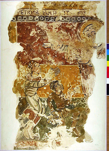 L'édifice, ravagé par les guerres de Religion, a été entièrement rebâti au 17e siècle. Quelques murs ont été conservés de l'édifice précédent. Le chevet devait comporter une abside flanquée de deux absidioles. Les maçonneries anciennes conservées sont toutes situées au chevet. Des peintures ont été retrouvées, sur la paroi d'une chapelle latérale, dans une embrasure qui devait être une entrée d'abside. La peinture découverte présente un soubassement décoré de personnages groupés en scènes et qui semblait occuper une large partie du mur jusqu'à un niveau un peu inférieur à celui des naissances des arcs. Les scènes sont limitées, vers le haut, par deux galons, l'un orné de petits cercles, l'autre à fond blanc portant des inscriptions. Au-dessus des galons se trouve un élément de large bordure à motif de feuillages. Les arcs sont décorés de deux larges bandes. La première, placée en archivolte, représente un galon plié en chevrons, encadré de petites perles. La seconde est formée, sur un fond de petites perles régulièrement disposées, d'une série de cinq médaillons encadrés de galons et de perles, où sont représentés des figures. Il pourrait s'agir d'un décor du 12e siècle.