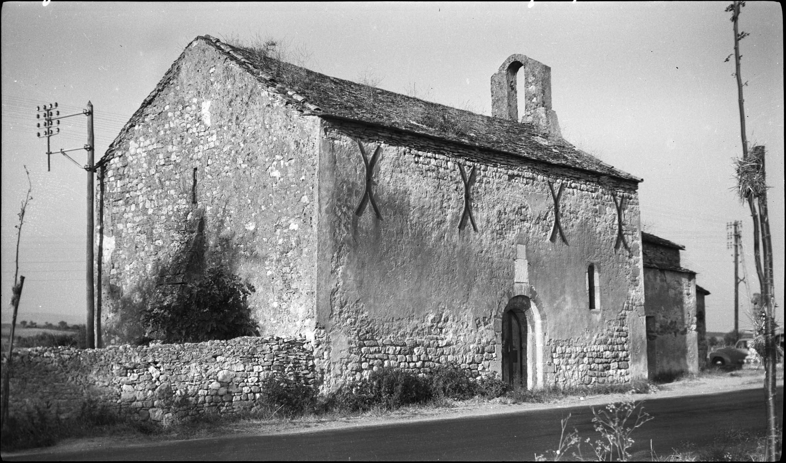 Aucune mention certaine de l'église n'apparaît avant 1641. Une maladrerie aurait existé au sud, au lieu-dit "la Misère". L'édifice est à nef unique, choeur et abside circulaire à plan outrepassé. La nef est plus large et plus haute que le choeur, avec un axe dévié. Trois séries d'appareils sont visibles. A l'abside et au choeur, petit appareil allongé. Cet ensemble est considéré comme formant l'édifice primitif, pouvant être antérieur au 10e siècle. La nef, dont la construction peut se situer au 10e ou 11e siècle, présente un petit appareil presque cubique, en lits bien horizontaux. Enfin, piliers, arcades intérieures et arcs doubleaux sont en moyen appareil, taille et joints soignés, et peuvent être attribués à la fin du 11e ou au début du 12e siècle, tout comme le portail sud. Une restauration générale a dû avoir lieu au 17e siècle. L'enduit intérieur conserve la date de 1639. Dans le mur sud du choeur est percée une porte rectangulaire, ensuite transformée en fenêtre, par laquelle passants et charretiers jetaient des pièces de monnaies pour assurer la protection de leur voyage. La paroi sud du choeur conserve une pierre sculptée de deux oiseaux se suivant, en faible relief méplat, et de facture archaïque.