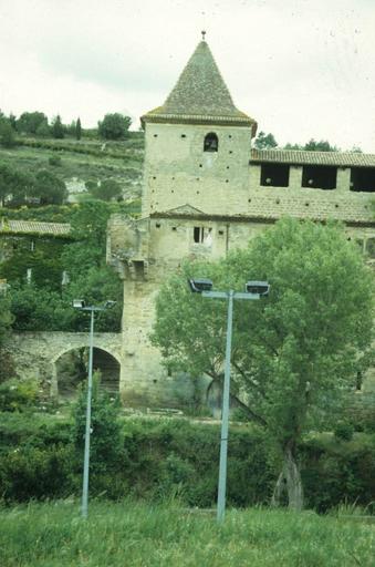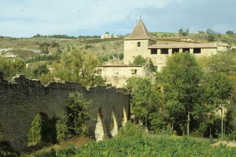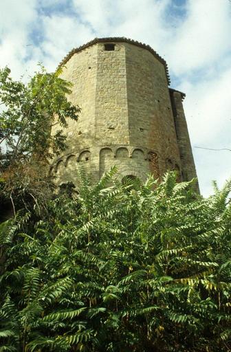 Ancienne église abbatiale. La fondation du monastère remonterait à 780 ou 811 (selon les lettres de Charlemagne datées de la 44ème année de son règne). Elle serait due à un seigneur Attala qui en fut le premier abbé. Les moines vivaient sous la règle de Saint-Benoît. L'église se trouvait dans la partie nord des quatre corps de bâtiments composant le carré de l'abbaye. Elle date probablement du 12e siècle et est la seule construction subsistante, avec l'aqueduc et le bassin. L'édifice se compose d'une nef de trois travées voûtées d'arêtes, la troisième travée formant choeur. L'abside demi-circulaire est voûtée en cul de four et ornée extérieurement de bandes lombardes. Elle est précédée, à l'ouest, d'un clocher-porche. Le clocher, formant narthex, a son étage inférieur éclairé par un oculus. La porte d'entrée a été remaniée au 17e siècle. Au 16e siècle, une surélévation a été construite au-dessus de la nef et de l'abside. Elle forme une grande salle au-dessus de la nef, et un réduit à six côtés qui pouvait servir à la défense, sur l'abside. Cette surélévation a probablement entraîné la déformation des voûtes de la nef.