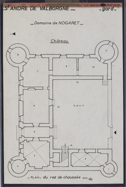 Nogaret était fief noble et seigneurie dépendant du comte d'Alès. La première mention remonte au 13e siècle. Le château développe aujourd'hui, autour d'une cour, un quadrilatère renforcé aux quatre angles principaux par une tour. Le corps principal nord est percé d'un passage qui mène de la cour au parc, et comprend deux ailes en retour. La cour est fermée au sud par un haut mur dans lequel s'ouvre une porte charretière. L'aile ouest présente deux baies dont l'encadrement permet de donner une datation stylistique approximative et de faire de ce corps de bâtiment le noyau primitif bâti à la fin du 15e ou au début du 16e siècle. Les autres encadrements ne peuvent remonter au delà du 17e siècle. Les aménagements défensifs (plan d'ensemble fermé, tours d'angles pourvues de canonnières, entrées aménagées de façon défensive) datent de la période des guerres de Religion. Le dernier aménagement, en temps de paix, a vu l'ouverture de nombreuses baies aux étages et l'écrêtage des tours. A l'intérieur, plafonds à la française, parquets, gypseries rappellent l'appartenance des propriétaires à l'aristocratie huguenote.