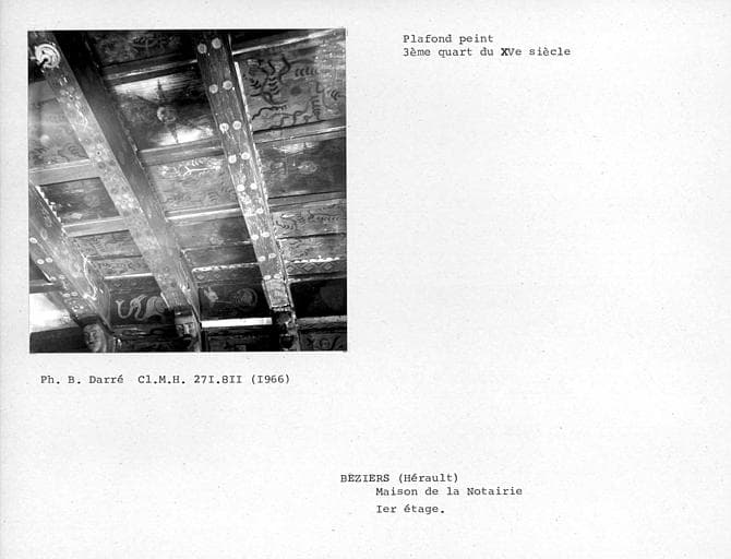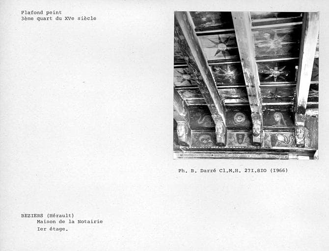 Le bâtiment abritant l'ancien tribunal, en totalité (cad. MN 97) : inscription par arrêté du 22 juillet 2004. Arrêté d'inscription "en totalité" le 19 janvier 2015 : "considérant que l'immeuble dit "maison de la Notairie" à Béziers présente sur le plan de l'histoire et de l'art un intérêt suffisant pour en rendre désirable la préservation en raison du caractère exceptionnel d'une telle cour de justice épiscopale médiévale et de l'intérêt de la demeure médiévale qui lui a été adjointe postérieurement, considérant la nécessité de donner une mesure de protection au titre des monuments historiques à l'immeuble en attente de la poursuite de la procédure de classement partiel engagé sur proposition de la CRPS". Classement MH en totalité le 4 avril 2015 : "présente, sur le plan de l'histoire et de l'art, un intérêt public, en raison du caractère exceptionnel de cet immeuble, élément majeur et rare de l'architecture publique de la fin de la période médiévale, et de l'importance de ses décors du XIVe siècle, connus ou à découvrir. (...) parcelle n°97 d'une contenance de 74 ca, de la section MN du cadastre de la commune (...) Le présent arrêté se substitue à l'arrêté d'inscription au titre des Monuments historiques du 15 janvier 2015 susvisé.