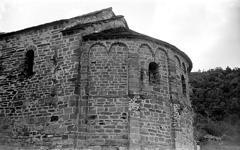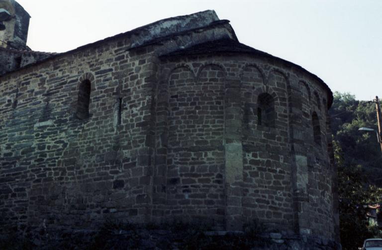 Orientée à l'est, l'église comporte une nef unique et une abside demi-circulaire extérieurement décorée d'arcatures. Une chapelle latérale a été tardivement construite au nord et une sacristie y a été ajoutée plus récemment. Entre la nef et l'abside s'intercalle un rappel de choeur correspondant à l'arc triomphal. Le mur ouest est surmonté d'un clocher-arcade à deux baies, l'étage supérieur en retraite. Refaite en 1736 et 1867, la porte occidentale a conservé, ou reçu en réemploi, des vantaux anciens munis de ferrures. Chaque vantail est décoré de trois pentures à spirales symétriques, assujetties par des clous à tête ronde. De simples fers plats complètent cet assemblage.