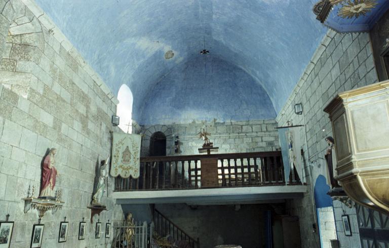 La première mention de l'église date de 1175. L'architecture, l'appareil mis en oeuvre, le décor lombard et le caractère de l'inscription gravée sur le linteau de la porte, attestent d'une construction caractéristique du 12e siècle. L'édifice est à nef unique et chevet semi-circulaire. L'ensemble, hormis le parement extérieur du mur de fond de la nef, est en marbre ocré. Mur goutterot nord et chevet sont couronnés par un rang d'arcatures lombardes monolithes sur modillons, surmonté d'une frise de dents d'engrenage. La porte d'entrée présente un linteau supportant un arc plein cintre à l'intérieur duquel s'inscrit, en retrait, un tympan monolithe nu. A l'intérieur, la nef et la travée de choeur sont couvertes d'une seule et même voûte en berceau légèrement brisé. La travée de choeur est flanquée de deux chapelles latérales, rectangulaire au nord, semi-circulaire au sud, couverte d'un cul de four. Une tribune à balustres, aparemment du 17e siècle, occupe le fond de la nef. Une porte en arc plein cintre, ménagée dans le mur de fond, permettait la communication entre la tribune et les bâtiments aujourd'hui disparus.