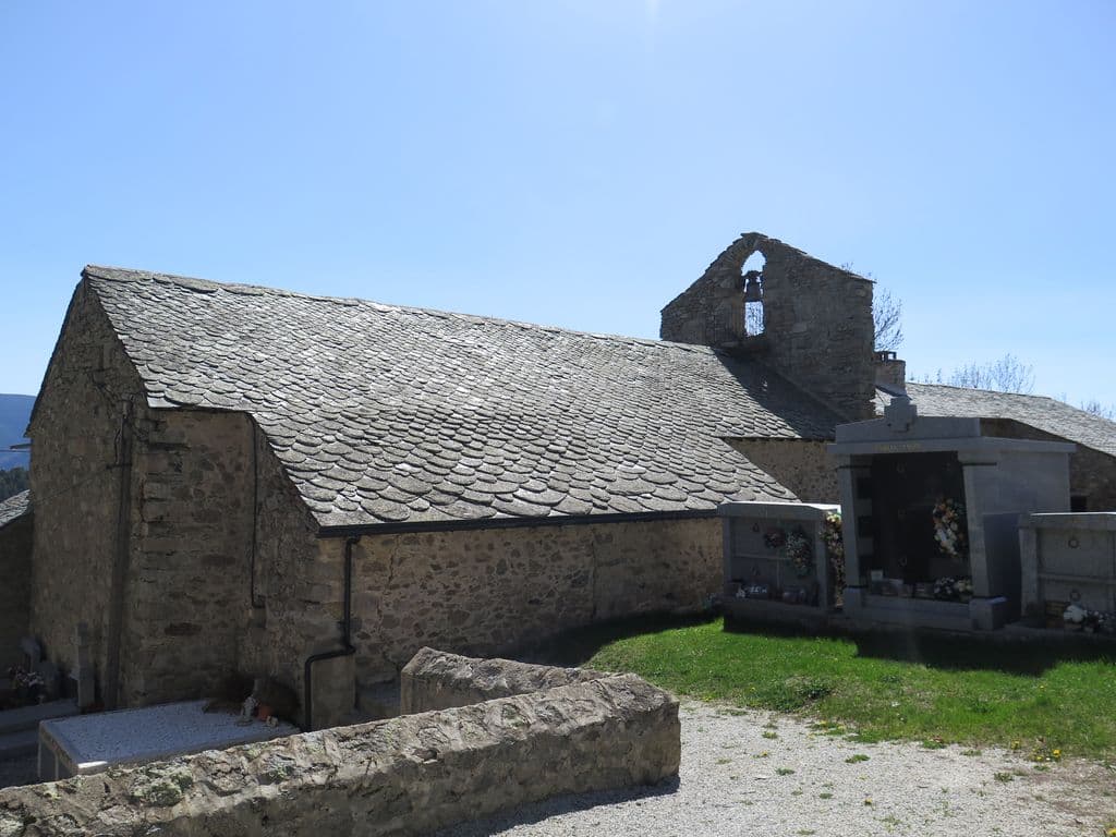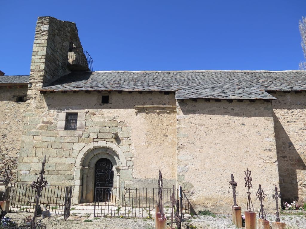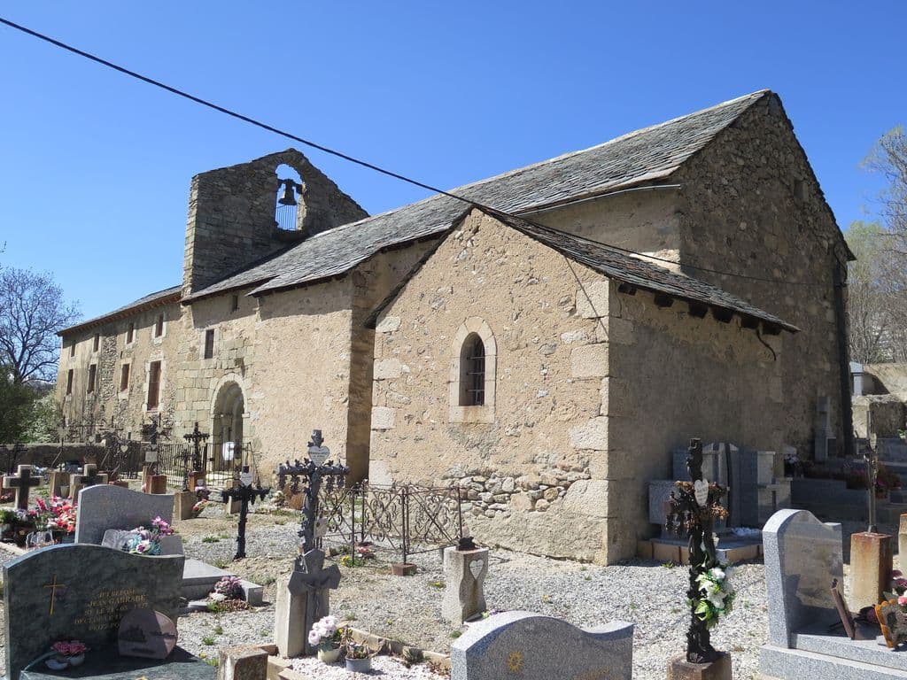 Construction rectangulaire en granit, composée d'une nef unique, d'une petite chapelle faisant saillie, au sud, et d'une sacristie moderne édifiée contre le chevet plat. L'édifice a subi d'importantes réfections, ne conservant de son appareil roman que celui des murs de la travée occidentale. A partir de là et vers l'est, la construcion a été reprise en appareil irrégulier. Dans ces murs modernes ont été encastrées diverses pierres portant des dates ou des inscriptions, indiquant que cette partie de la construction est postérieure à 1720. Le mur occidental roman est surmonté par un clocher-mur à baie unique. La base de ce fronton est ancienne et appareillée ; la partie supérieure triangulaire plus récente et en petits matériaux. L'arc de la baie campanaire a été repris en briques. Le portail est à triple rouleau, le second reposant sur des colonnettes à chapiteaux et l'arc extérieur étant décoré d'un chanfrein à demi-boules. Ces chapiteaux sont sculptés de personnages, avec le thème habituel du personnage d'angle symétrique, encadré par des personnages aux bras levés. Au-dessus de ce portail a été encastrée une tête dont la partie supérieure est plate, réemploi probable d'une console ou d'un modillon. Les vantaux sont intéressants par leurs pentures de fer rainuré se bifurquant en volutes et dessinant des X, les uns posés verticalement et les autres couchés.