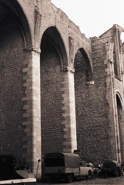 Les Grands Carmes se sont établis à Perpignan en 1213. Le cloître fut construit de 1333 à 1342. Au milieu du 19e siècle, il a été transporté pierre par pierre, par le baron Alexandre Guiraud, dans le parc du château de Villemartin, près de Limoux (Aude). L'église pourrait remonter au 14e siècle. L'ancien couvent fut transformé en arsenal au 17e siècle, et l'église, coupée par des planchers en bois, devint un dépôt annexé à cet arsenal. Durant la Seconde Guerre mondiale, les Allemands utilisèrent l'église comme dépôt de pneumatiques. Au moment de la Libération, ils mirent le feu à l'entrepot. L'église est un vaste édifice de type gothique languedocien. Il comporte une nef unique de huit travées, bordée de chapelles et couverte d'une charpente apparente. Il se termine par un chevet polygonal également bordé de chapelles. Le mur qui clôt le chevet est reporté à l'extrémité extérieure des contreforts, en sorte que les sept chapelles qui entourent les sept côtés du polygone du chevet, sont ménagées entre ces contreforts. Il est probable que cette disposition date du 14e siècle. La disposition primitive du 13e siècle, contemporaine de la nef, ne devait pas comporter de chapelles. Sous le chevet se trouve une crypte qui présente tous les caractères du 15e siècle. Le chevet est voûté en briques sur nervures de pierre. Les chapelles latérales, séparées de la nef par des arcs brisés, sont couvertes de voûtes sur croisées d'ogives en briques, avec clefs en pierre sculptées. Le portail en marbre est orné de chapiteaux autour desquels s'enroulent des animaux fantastiques. L'église renfermait autrefois une tribune qui se trouvait au fond de l'édifice et qui se composait d'un plancher de bois établi sur deux arcs en maçonnerie et orné de modillons sculptés et d'incrustations de carreaux décorés.