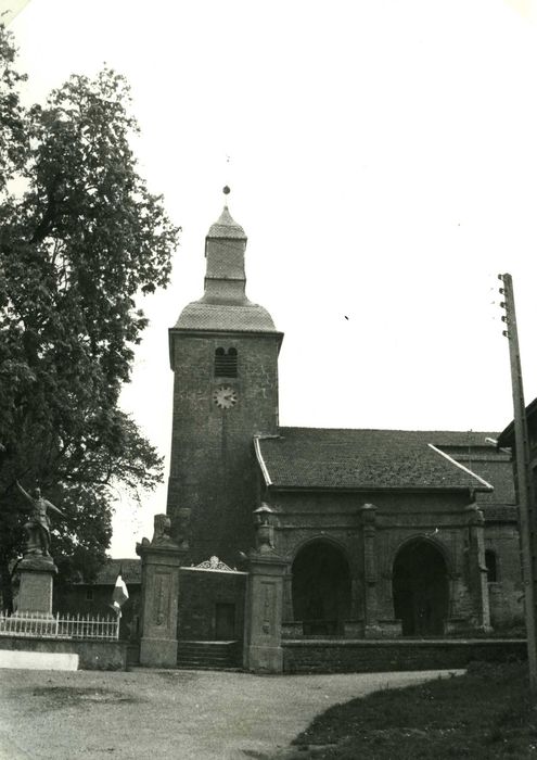 Style roman (école Treviroise Lorraine) ; Bas relief romain du 3e siècle au pied du clocher.