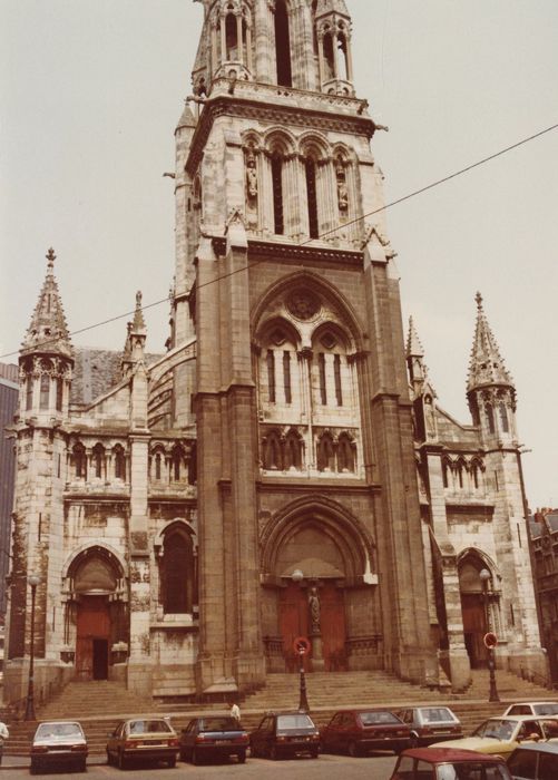 église à nef et deux collatéraux, transept, abside à déambulatoire et chapelles absidioles, clocher-porche à flèche, style néo-gothique rayonnant; élévation intérieure à trois niveaux: arcades, tribunes et baies sous voûtement à croisée d'ogive
