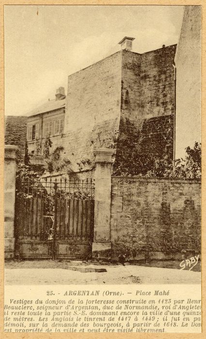 "La fortification appelée "donjon", est le reste des remparts d'Argentan construits au Moyen-Age par Henri Ier, seigneur d'Argentan et duc de Normandie. Les murs subsistants, en pierre de taille, ne sont pas antérieurs au 13e siècle. Les remparts furent partiellement démolis à partir de 1618. ££Le donjon est en réalité un élément de rempart de plan polygonal, non fermé. Il forme mur de soutènement d'une terrasse qui domine la ville. La muraille présente un soubassement vertical de cinq mètres de haut, puis un vaste glacis, enfin une partie supérieure avec un léger fruit."