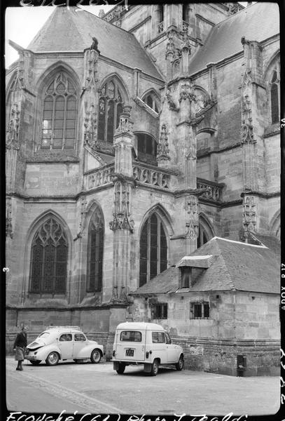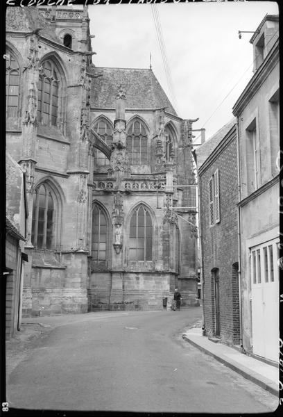 L'église se compose d'une nef paraissant remonter au 13e siècle, accostée de deux bas-côtés. De la tour ne reste qu'un pan de muraille. Le pignon occidental est ajouré de fenêtres et meneaux flamboyants. Le choeur a été démoli au 16e siècle pour être remplacé par un transept et une abside dont l'axe a été rejeté vers le nord. Chaque partie du transept se termine par des chevets à trois pans. Le triforium se compose d'une balustrade ajourée dont chaque travée comporte trois arcades cintrées. Les voûtes sont à nervures et les clefs pendantes sculptées datent du 17e siècle. Sur la toiture, tour carrée dont chaque face est ajourée de deux baies cintrées prises entre des pilastres. Tourelle cylindrique à l'angle sud-ouest, abritant l'escalier menant aux chambres des cloches.