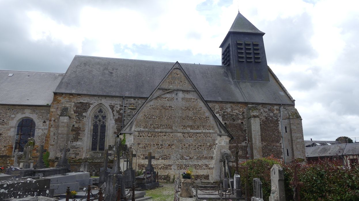 L'église avait été donnée par les Giroie à l'abbaye de Saint-Evroult en 1128. Elle fut brûlée quelques années plus tard, lors des luttes entre Etienne de Blois et Geoffroi Plantagenêt, comte d'Anjou. L'édifice actuel succède à l'édifice plus vaste du 13e siècle et aux remaniements dus aux destructions des guerres de Religion (1562). L'église comprend une nef dont la première travée supporte le clocher, et un choeur plus étroit terminé par un chevet plat. Une chapelle est accolée à la façade nord de la nef, et une sacristie à la façade nord du choeur. La nef semble dater du 13e sècle pour ses contreforts et son pignon occidental. L'appareillage est en silex coupé horizontalement par des bandes de pierre calcaires. Toutes les baies latérales sont de style flamboyant. La porte de la façade sud a été refaite au 17e siècle. Un reste d'appareillage en damier mi-silex, mi-pierre blanche, est visible sur la première travée au sud. La chapelle nord a été construite au 17e siècle et s'orne d'un décor classique avec pilastres cannelés. Le choeur a été entièrement reconstruit au 17e siècle.