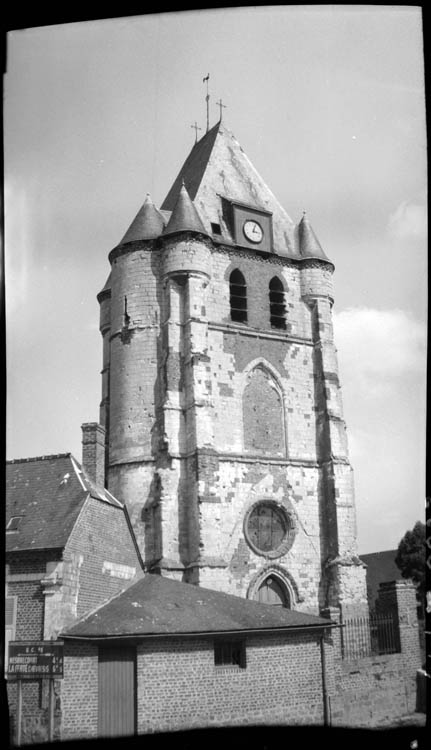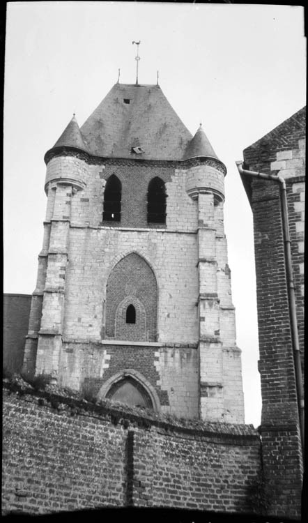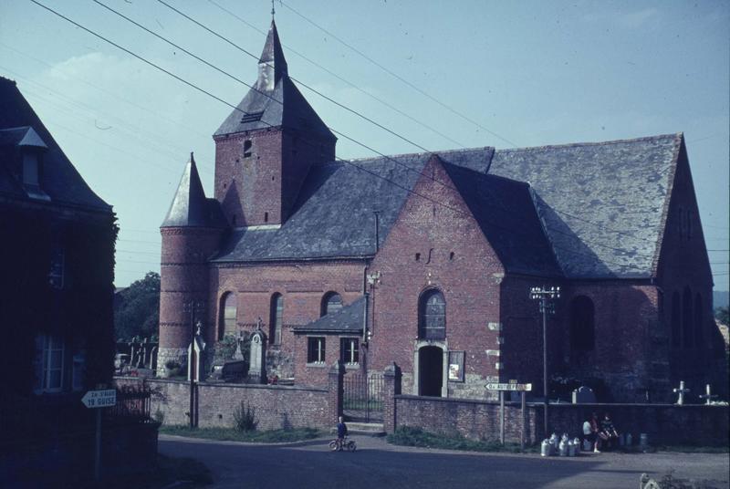 Eglise construite en 1632, ayant subi des modifications au 19e siècle. Edifice en brique sur soubassement de grès, à décor de brique vernissée, en forme de croix latine : le petit donjon rectangulaire, flanqué à l'ouest de deux tourelles de plan circulaire, est encastré dans la partie occidentale de la nef. Un transept aux bras saillants formés par deux chapelles sépare la nef du choeur, peu profond, à chevet plat, soutenu aux angles par deux contreforts. Le donjon, à quatre niveaux, est percé de batteries de meurtrières superposées. L'église possède des vitraux datés de 1961 et signés Melle de Troeyer, Reims.