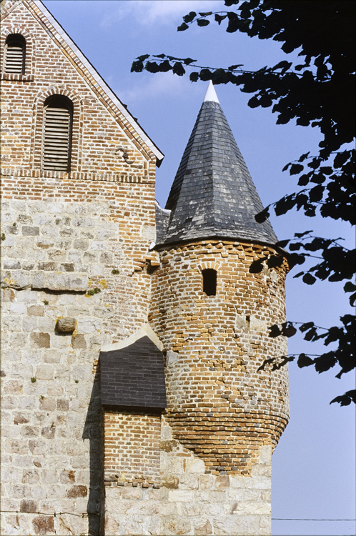 Nef en grès, donjon en brique.