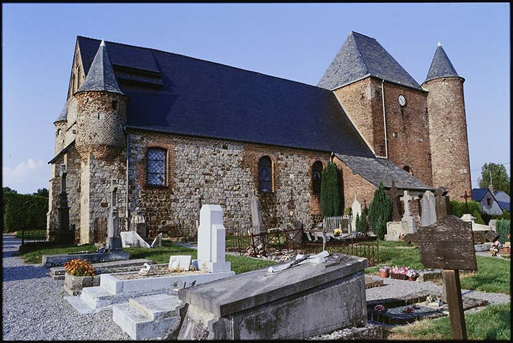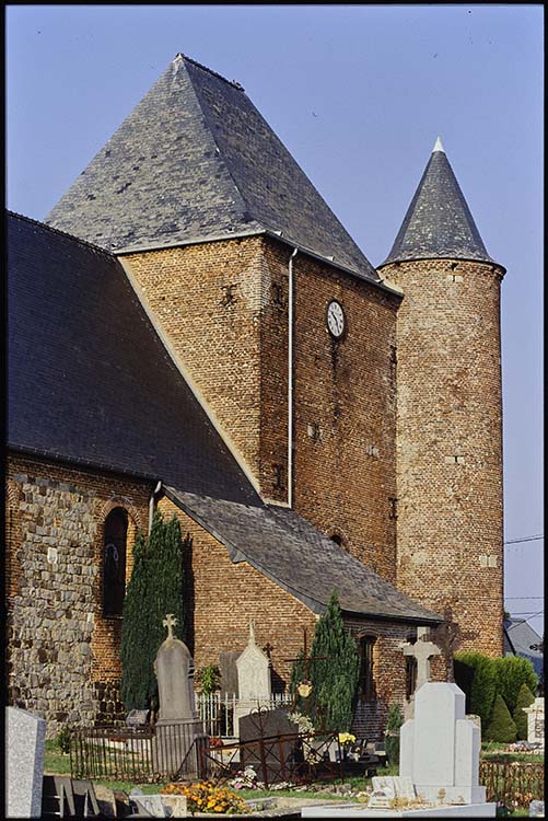Appartient à la série des églises fortifiées de la Thiérache. Façade occidentale du 14e siècle. Donjon de 1580. Echauguette du début 17e siècle, beffroi de 1633. Modifications au 19e siècle (réalisation des verrières en 1881-1882).