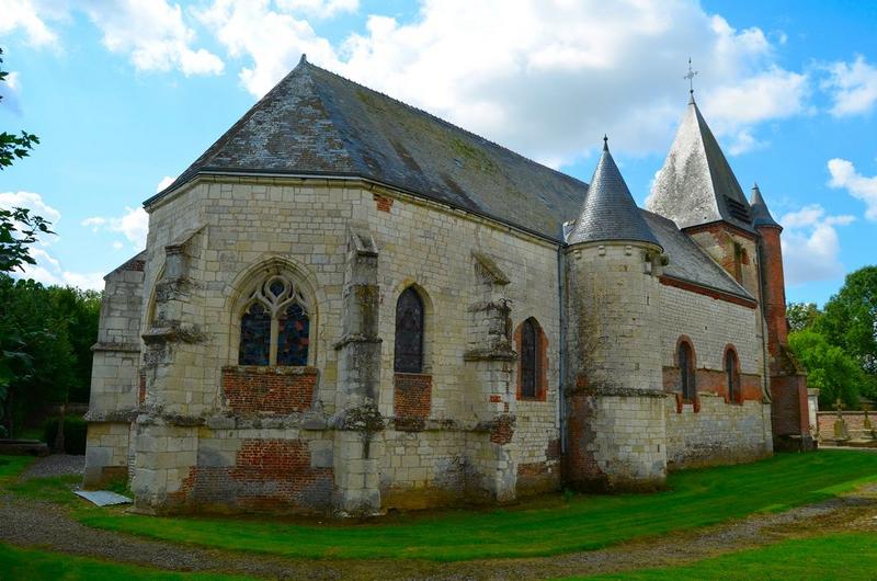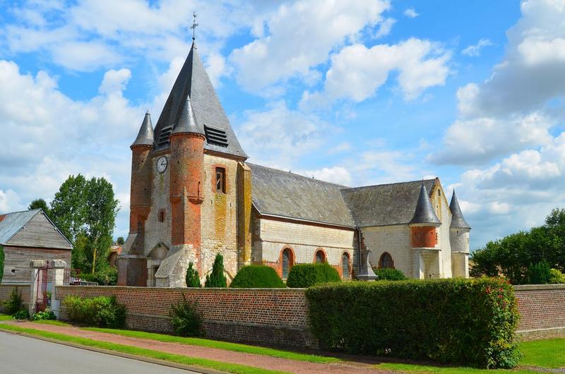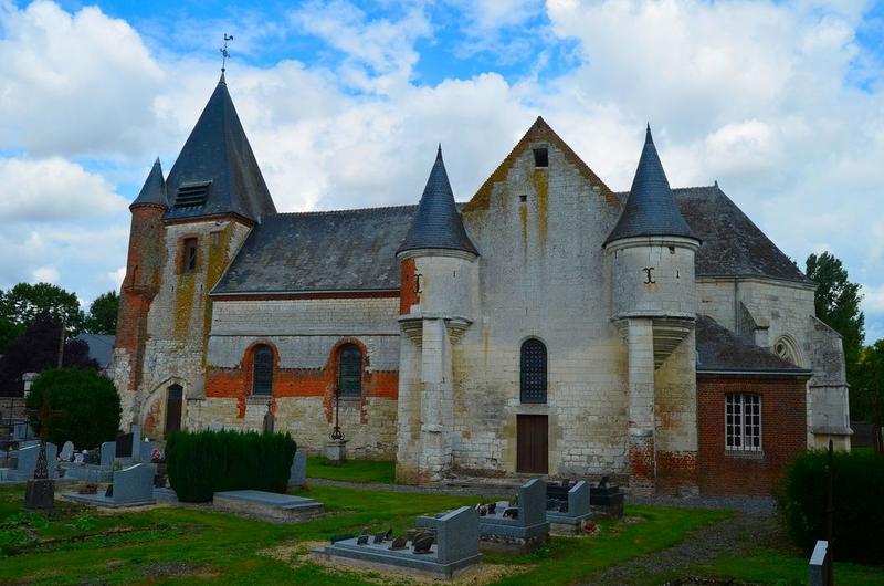 Eglise bâtie presque entièrement en pierres blanches, hormis les tourelles de façade et quelques raccords de brique, a été en majeure partie édifiée au 16e (choeur et base du donjon) et au 17e siècle (nef et parties hautes du donjon). Le donjon-clocher est renforcé de deux tourelles en encorbellement, et repose sur un porche, aux ouvertures latérales bouchées. La nef est pourvue au sud d'une chapelle formant croisillon de transept et présentant deux échauguettes à poivrières. Sur le flanc sud de la nef en symétrie de la chapelle latérale, une autre tour cylindrique accoste le mur gouttereau. L'édifice présente une grande homogénéité stylistique en dépit des diverses campagnes de construction qui la caractérisent. Plusieurs phases de fortification s'y juxtaposent, depuis les éléments défensifs relativement symboliques de la chapelle latérale jusqu'aux tourelles du donjon-porche, témoigne de fortifications ultimes (17e siècle) qui rapprochent cet édifice d'autres églises thiérachiennes plus septentrionales (Macquigny, Fontaine-les-Vervins).