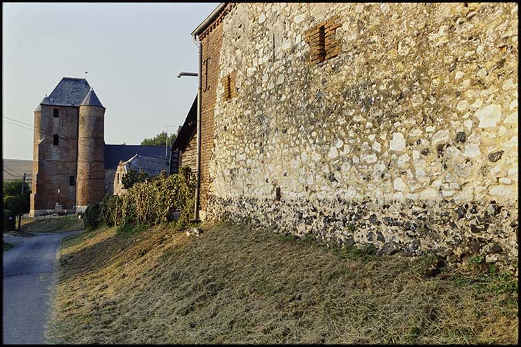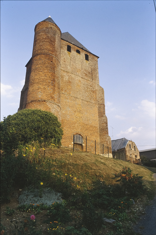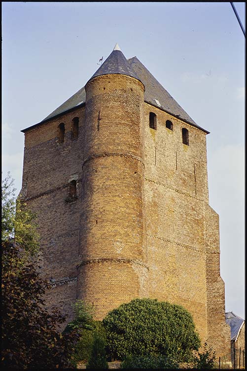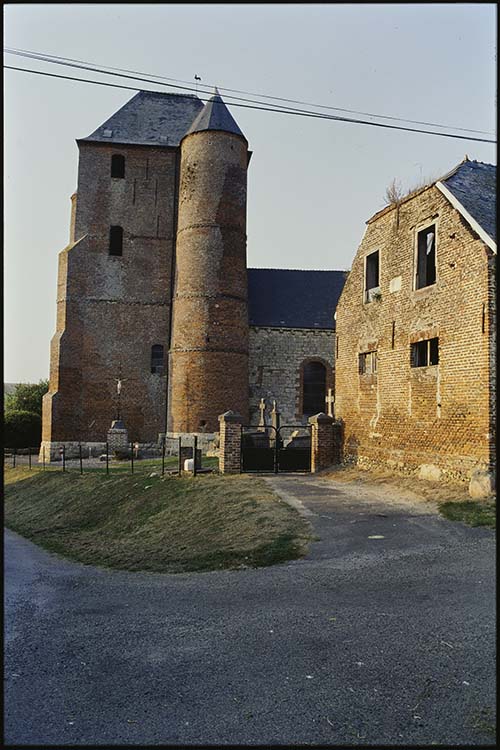Eglise du 12e siècle en pierre blanche. Donjon en brique à décor de briques vernissées du 17e siècle. Appartient au groupe des églises fortifiées de Thiérache.
