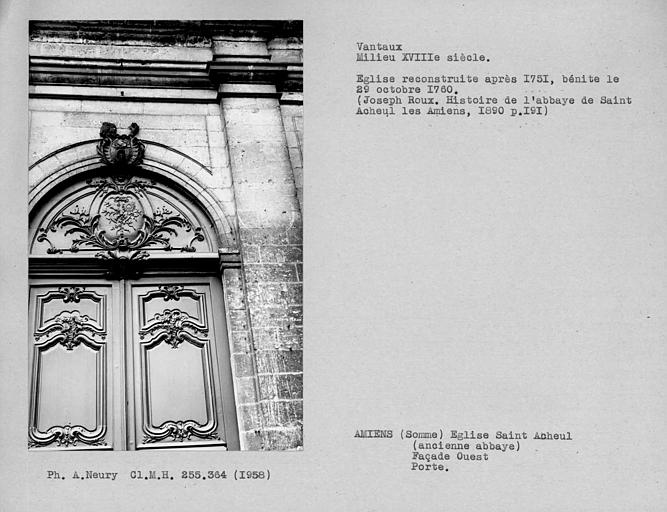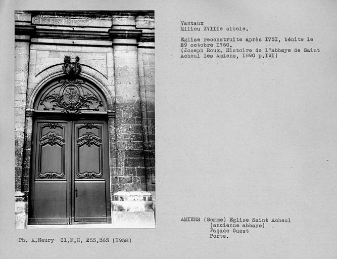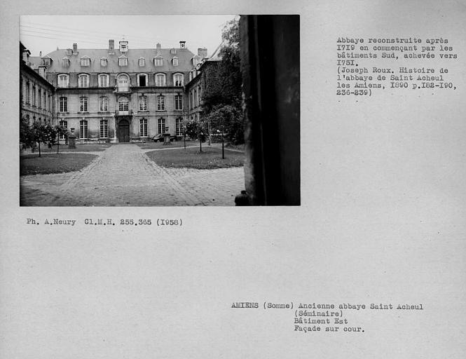 Saint-Acheul fut le siège d'une célèbre abbaye augustine, fondée en 1085 sur le tombeau présumé de saint Firmin le Martyr, évangélisateur et premier évêque d'Amiens, qui aurait fondé en ce lieu le premier sanctuaire chrétien amiénois et y aurait subi le martyre en 287. L'abbaye, reconstruite aux 17e-18e siècles, subsista jusqu'en 1790 et devint sous la Restauration un collège de Jésuites, fermé en 1830. Elle est occupée aujourd'hui par un collège privé. L'église abbatiale, devenue église paroissiale, a été rebâtie dans les années 1750-1770. Elle présente une sobre architecture en pierre de taille, de style classique. La façade présente une porte en plein-cintre cantonnée de pilastres à chapiteaux d'ordre toscan. A l'étage, une baie et des niches sont disposées entre des pilastres à chapiteaux d'ordre dorique. Ceux-ci supportent l'entablement à triglyphes, sur lequel repose un fronton triangulaire. Sous le choeur, un caveau occupe le lieu où fut découvert miraculeusement le corps de saint Firmin. Y sont conservés plusieurs sarcophages et des bas-reliefs du 15e siècle relatifs à l'histoire de saint Firmin.