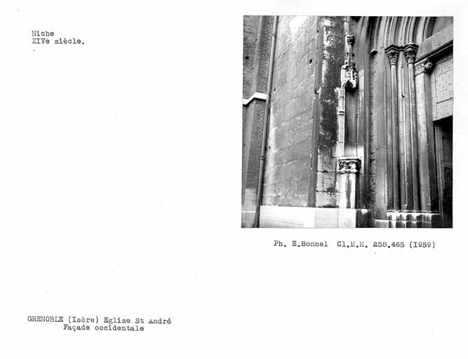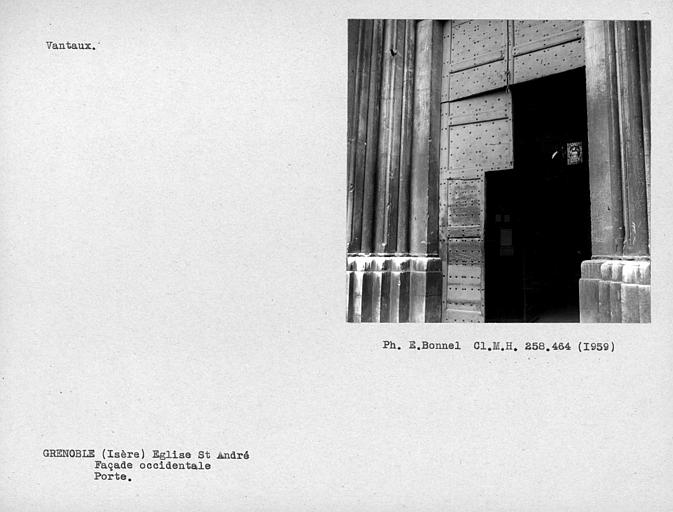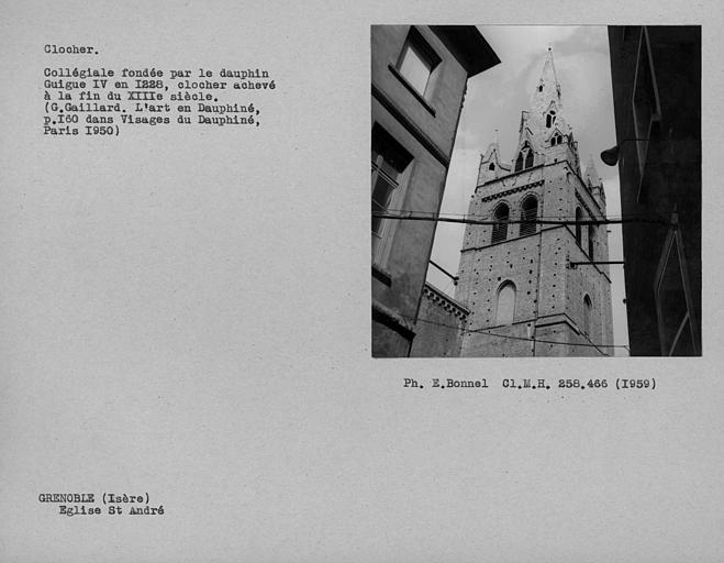 En 1226, le Dauphin Guigues VI André fonde un corps de chanoines à son service et engage la construction de l'église collégiale en 1228. L'édifice est construit en briques pour plus de rapidité et d'économie. Le chantier s'achève certainement vers 1298 avec l'édification du clocher. L'église devient alors la chapelle privée et la nécropole dynastique des Dauphins. Après la formation du parlement du Dauphiné, la collégiale devient aussi église du Parlement. Elle abrite les sépultures des conseillers du parlement, de gouverneurs de la province et de notables grenoblois. Aux 14e et 15e siècles, des chapelles sont adossées à la façade nord. En 1562, les troupes du Baron des Adrets pillent la collégiale et détruisent le décor sculpté ainsi que les tombeaux des dauphins. L'intérieur de l'église est réaménagé aux 17e et 18e siècles. Le chapitre est supprimé en 1790. L'église est rendue au culte en 1802. Le cloître au sud de la collégiale a été démoli vers 1860. Une commande de vitraux est passée à la fin du 19e siècle auprès du maître verrier Lucien Bégule. ££L'édifice allie des caractères du roman tardif et du gothique primitif. Sur un plan en croix latine, l'église originelle comportait une nef unique, un transept saillant supportant le clocher et un choeur à chevet plat. Le portail nord fut déplacé et encadré d'un décor gothique flamboyant au 15e siècle, et la façade prolongée au nord-ouest. Le linteau, les voussures et les piédroits du portail ancien sont recouverts d'un décor peint polychrome datant du 14e siècle. Le portail sud est l'ancien accès au cloître démoli. Le tympan de ce portail présente une sculpture en bas-relief représentant les anges de la Mer et de la Terre encensant une croix. Le portail occidental porte un tympan orné de saint Jean-Baptiste accompagné de l'ange crucifère. Le caractère archaïque de la sculpture pose la question de la provenance du bas-relief qui pourrait être un remploi de l'ancienne église Saint-Jean-Baptiste démolie en 1562. Un escalier hélicoïdal à noyau creux encloisonné dans un angle de la chapelle Notre-Dame-de-la-Consolation donne accès à des salles et des tribunes au-dessus des chapelles et du porche. Les décors, tant intérieurs qu'extérieurs, sont de style gothique. La sacristie fut construite au 13e siècle pour accueillir les archives des Dauphins et les regalia. Le clocher en tuf repose sur le bras sud du transept. La tour abrite une salle voûtée sur croisée d'ogives.