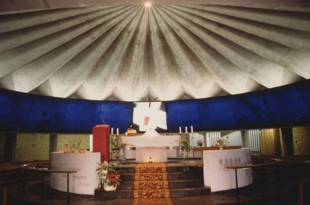 Eglise reconstruite de 1958 à 1963, au titre des dommages de guerre, par l'architecte Georges-Henri Pingusson, en collaboration avec l'architecte Paul Aynes. Elle est située à 700 mètres de l'église endommagée lors des combats de 1940, dont subsiste une tour romane. L'édifice de Georges-Henri Pingusson, construit en béton armé, se caractérise par son plan en rotonde, sa couverture en terrasse et son campanile indépendant. La statue du Christ ainsi que le crucifix de bronze sont réalisés par Lambert-Rucki, le vitrail du baptistère par Martin Granel ; le vitrail du tympan a été dessiné par Pierre Bozzolini.