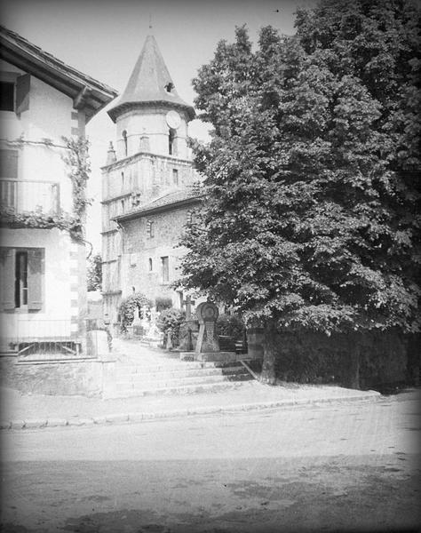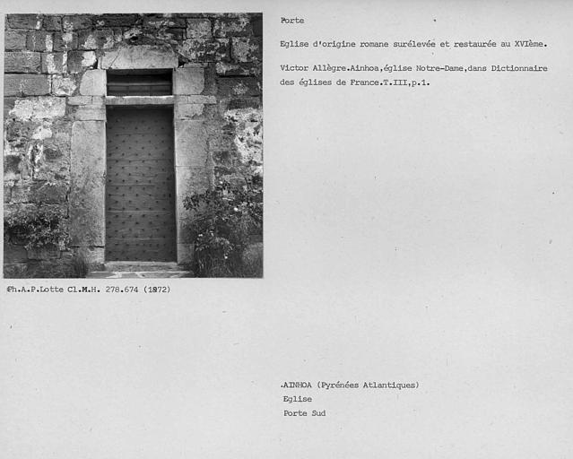 Eglise construite au 13e siècle lors de la fondation et du développement du bourg d'Ainhoa, surélevée ultérieurement (16e ou début 17e siècle), dotée du clocher-tour carré actuel courant 17e siècle et des tribunes de la nef (sans transept) en 1649. Décor caractéristique des églises basques.