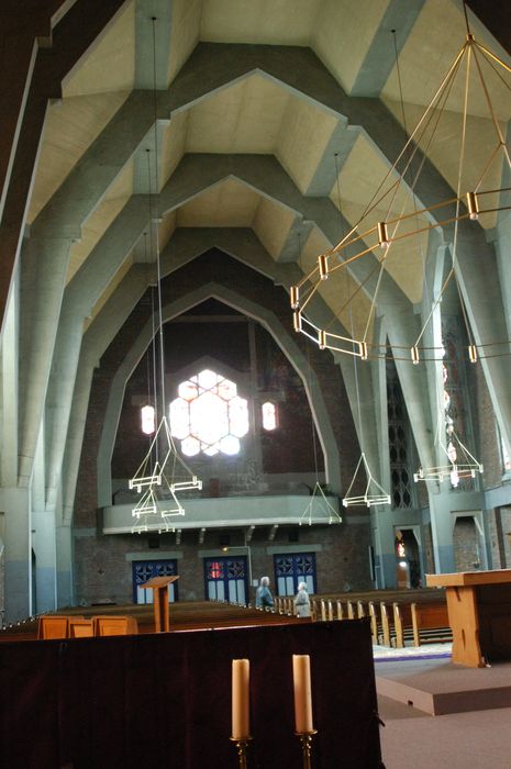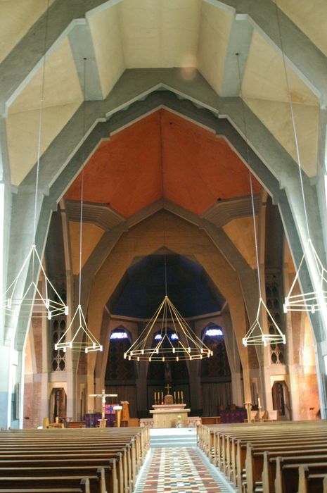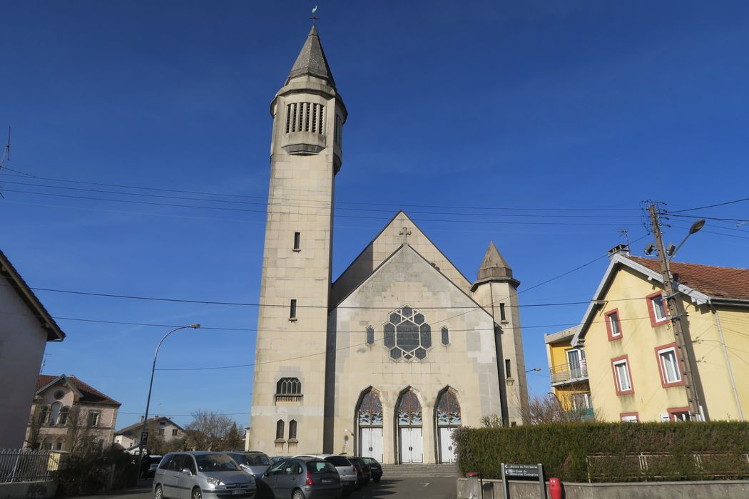 Eglise construite de 1929 à 1932 sur les plans de l'architecte bénédictin Dom Paul Bellot assisté par l'architecte Marcel Hézard. De plan en croix latine, l'église comprend un large porche entre un clocher et une tour d'escalier à vis, une nef de trois travées, un large transept et un choeur à abside polygonale. L'ossature de l'édifice est constituée d'arcs formés de segments rectilignes portant des poutres horizontales en béton armé. Les supports des arcs, doublés par des contreforts intérieurs ajourés de claustras déterminent des passages latéraux élargissant la nef. Les murs extérieurs se composent d'une double paroi faite de brique polychrome à l'intérieur, et à l'extérieur de carreaux de pierre locale reconstituée de deux couleurs. Des voiles fins de béton couvrent l'ensemble de sortes de voûtes à facettes peintes de différentes couleurs.