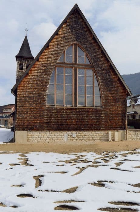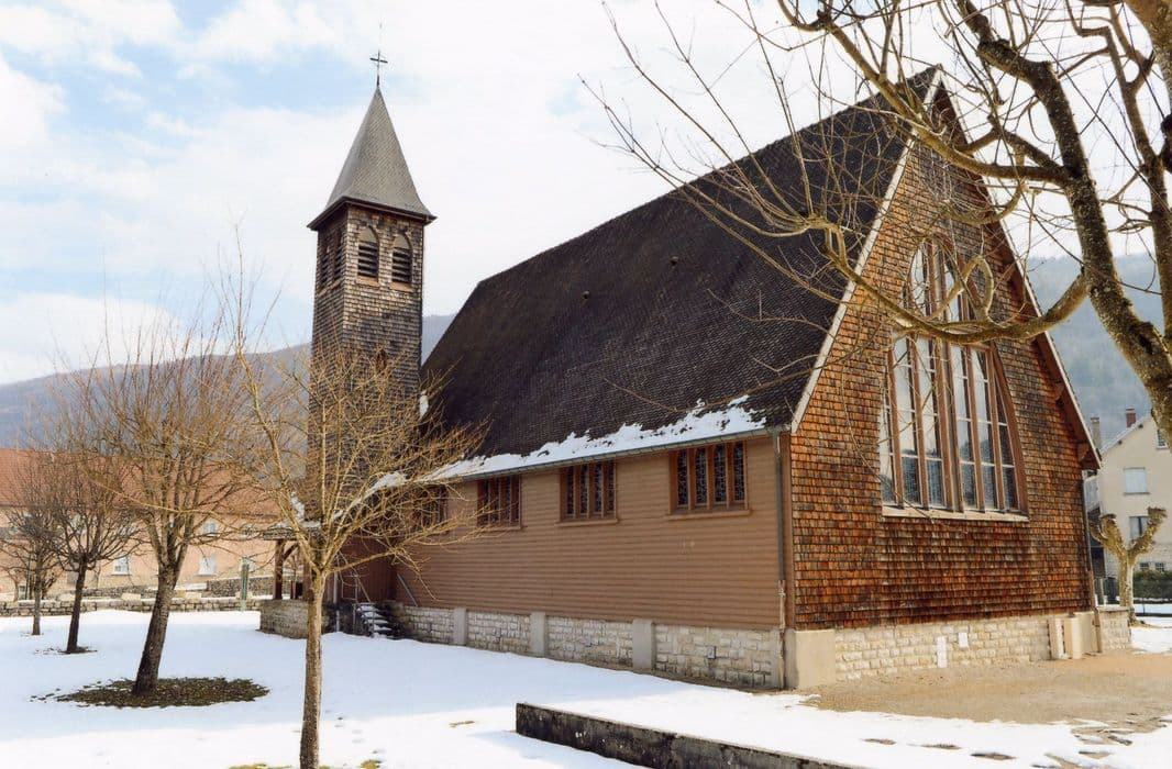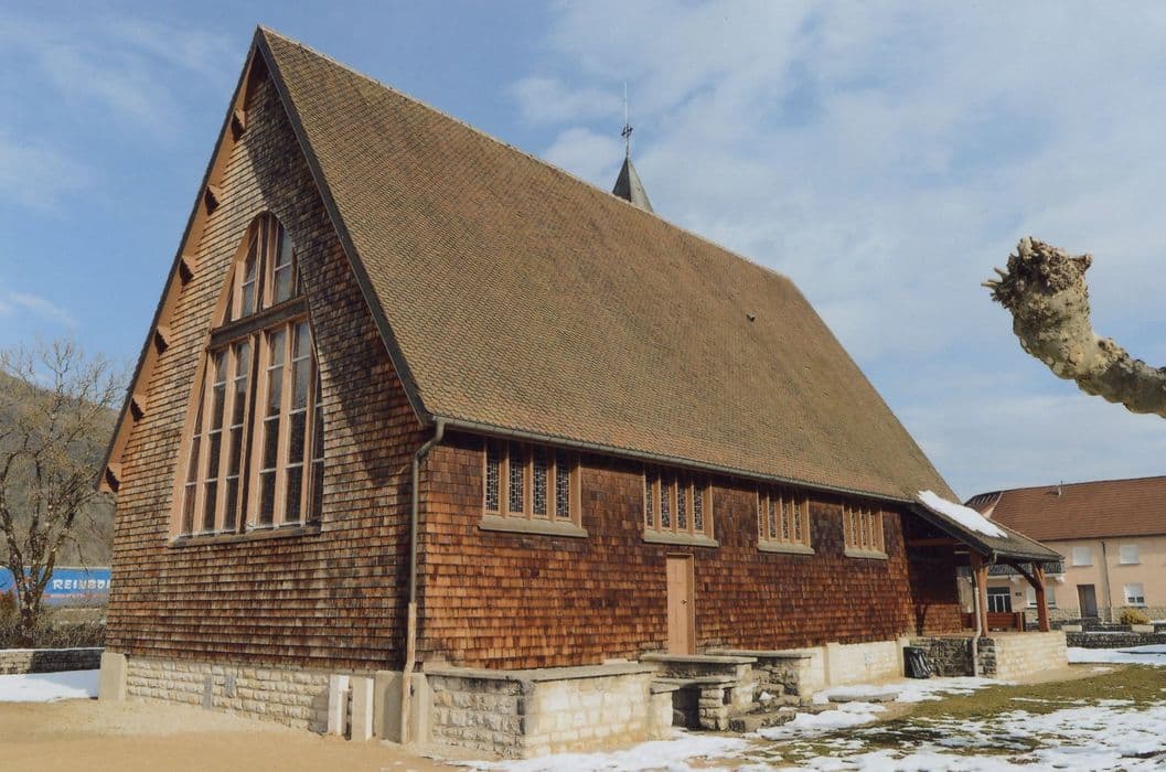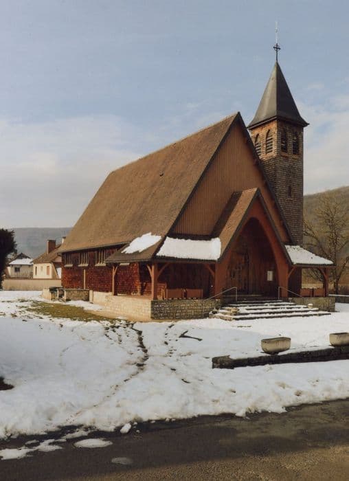 L'ancienne église fut partiellement détruite en juillet 1944 par les Allemands. Les dommages de guerre ne purent financer la nouvelle construction car l'ancienne avait en partie échappé au sinistre. La commune n'en ayant pas les moyens, c'est Edgar Faure, ministère du Budget, conseiller général du Jura qui, lors de sa visite à l'Exposition internationale du bois à Lyon en 1951, demande à la Chambre nationale des industries du bois de faire don de cette église à la commune. L'église fut exécutée en 70 jours, exposée à Bois-sur-Rhône par les Etablissements Chalos et Fils de Saint-Brieux. Les 17 essences utilisées pour la construction furent offertes par les fédérations et producteurs français, importateurs, commissionnaires de bois exotiques. Démontée et transportée de Lyon vers Lavancia puis remontée en trois semaines sur le site actuel en février 1952, elle fut inaugurée le 22 juin 1952. EN 1965, des travaux de peinture et de toiture furent entrepris pour la rénover et en 1995, le pignon et le clocher furent couvert de bardeaux thuya géant de Colombie.