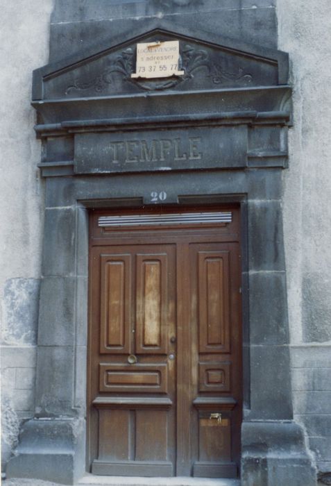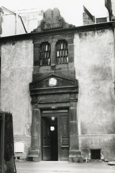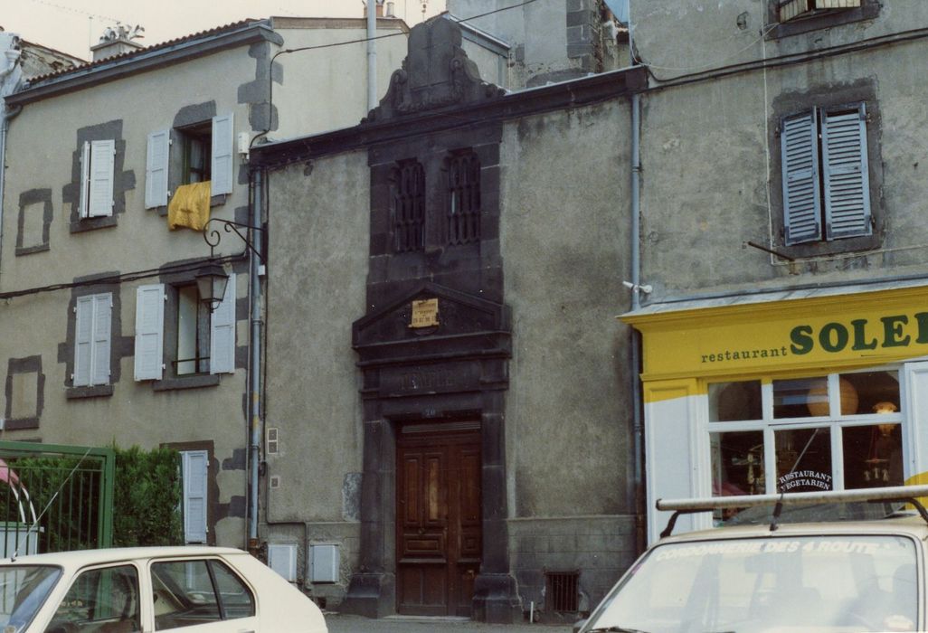 En 1862, la construction de la synagogue est due à la volonté de la communauté juive de Clermont de s'installer dans l'ancien quartier juif médiéval. L'aménagement d'une petite maison achetée à cette occasion fut confié à François-Louis Jarrier qui éleva une façade presque aveugle comportant une travée centrale architecturée en pierre de Volvic, composée d'un portail à fronton dont l'entablement porte l'inscription "Temple". L'intérieur a perdu ses aménagements lors du déplacement du lieu de culte dans un immeuble de la rue Blatin, en 1966, puis de la cession de l'édifice en 1978 à une loge maçonnique.