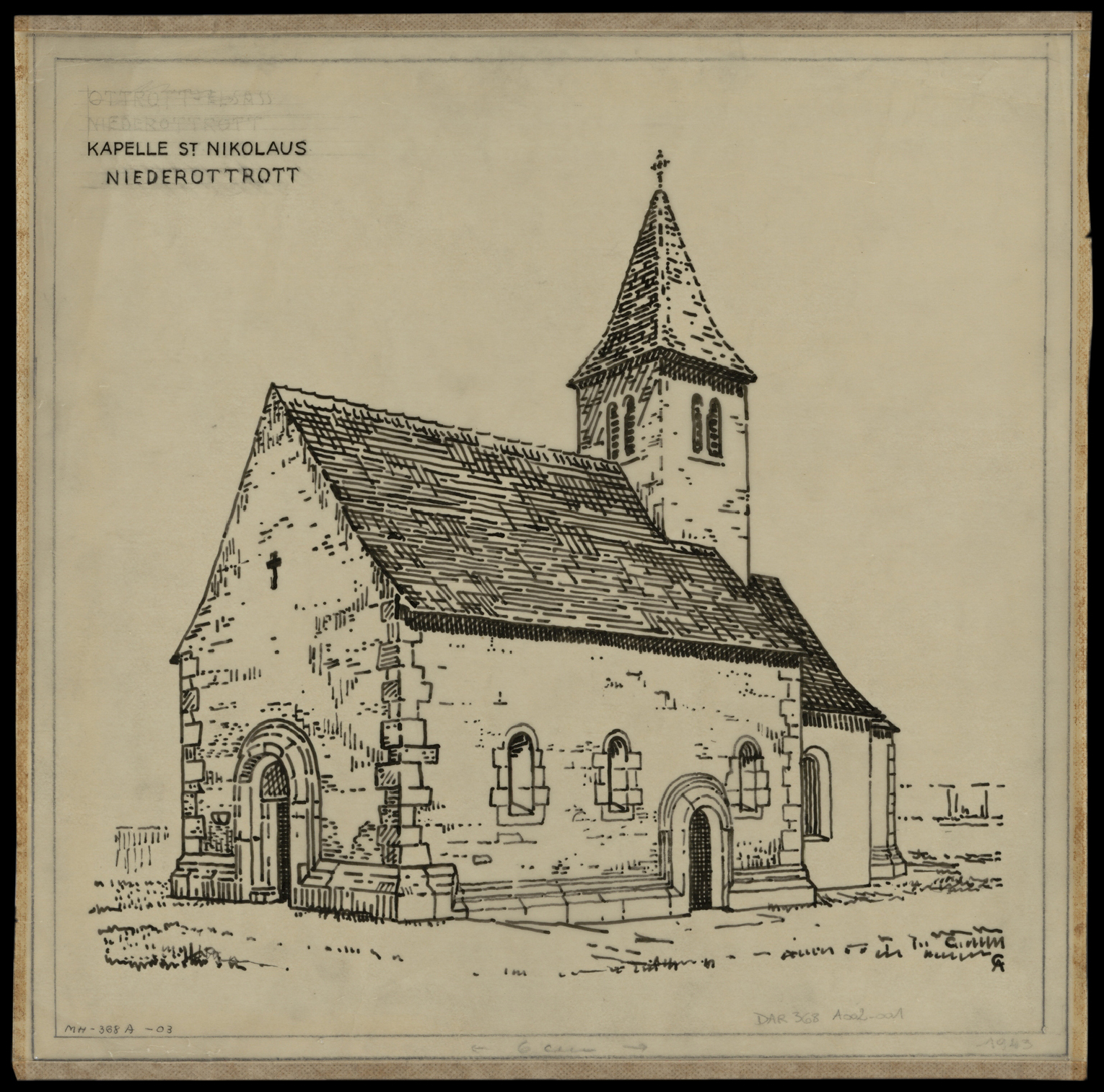 Edifiée à la fin du 12e siècle, la chapelle a subi des dommages durant la guerre de Trente ans. Escalier extérieur et tribune d'orgue du 19e siècle. Grande restauration intérieure vers 1860, le mobilier d'origine est remplacé par un mobilier néo-roman. Peinture intérieure refaite en 1942.