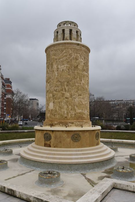 Chantier emblématique de la ceinture à la suite de la démolition de l'enceinte de Thiers dans les années 1920, l'aménagement de la porte de Saint-Cloud est un des rares grands programmes urbains parisiens à voir le jour. Architectes et sculpteur conçoivent un terre-plein central elliptique où prennent places les deux fontaines monumentales et leur bassin. Chacun des deux tambours sculptés en bas-relief repose sur un emmarchement et est coiffé d'un couronnement orné de dalles de verre. Le tambour sud représente la Seine apportant à Paris les richesses de la terre. Le tambour nord illustre Paris. Les parois des bassins sont tapissées de dalles à verre. Les fontaines ne jouant plus de rôle utilitaire, ce sont la mise en scène et les effets décoratifs qui prévalent. L'ensemble s'inspire des féeries éphémères conçues pour les grandes expositions internationales et annonce les Fêtes de la Lumière de l'Exposition universelle de 1937.