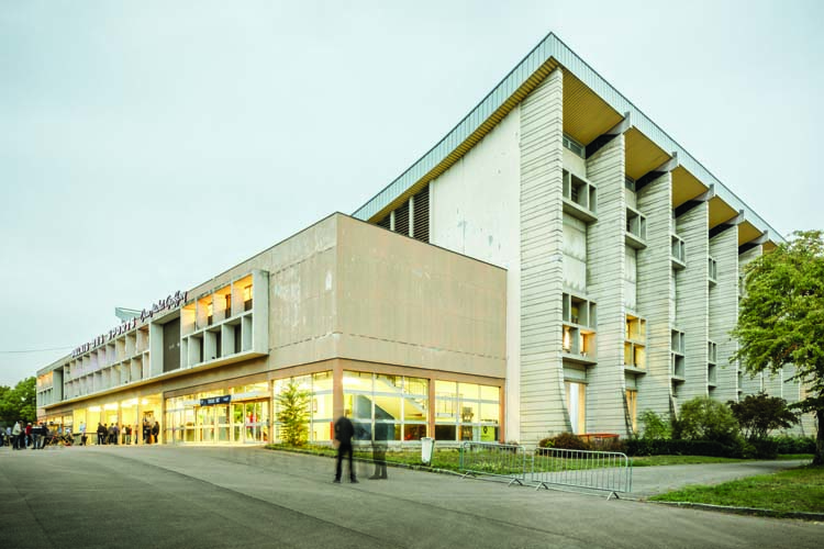 Le Palais des Sports de Dijon repose sur une conception fonctionnelle et polyvalente afin de lui assurer un statut d’équipement omnisports. L’édifice gravite autour d’une salle principale placée à rez-de-chaussée et équipée de gradins (3-4000 places) servant pour les manifestations sportives et les spectacles. Le plan carré est un parti pris des architectes afin d’intégrer tous les éléments du programme au sein de l’édifice depuis les locaux techniques et les salles d’entraînement en sous-sol jusqu’aux salles de réunion et au locaux administratifs dans les étages. Les façades sont caractérisées par une composition géométrique et sculpturale donnant un caractère monumental à l’ensemble. Laissées brutes de décoffrage, elles jouent sur les différents traitements du même matériau : piliers saillants traités en bossage*, cadres lisses soulignant les ouvertures et profils en pointes de diamant* en ornement. La Palais des Sports représente également une prouesse technique de par sa charpente incurvée en bois lamellé-collé*. Conçue selon une voûte incurvée, la charpente permet de franchir les 76 mètres de portée de la salle principale et compte parmi les plus grandes de l’époque avec un mode d’assemblage en chaînette.