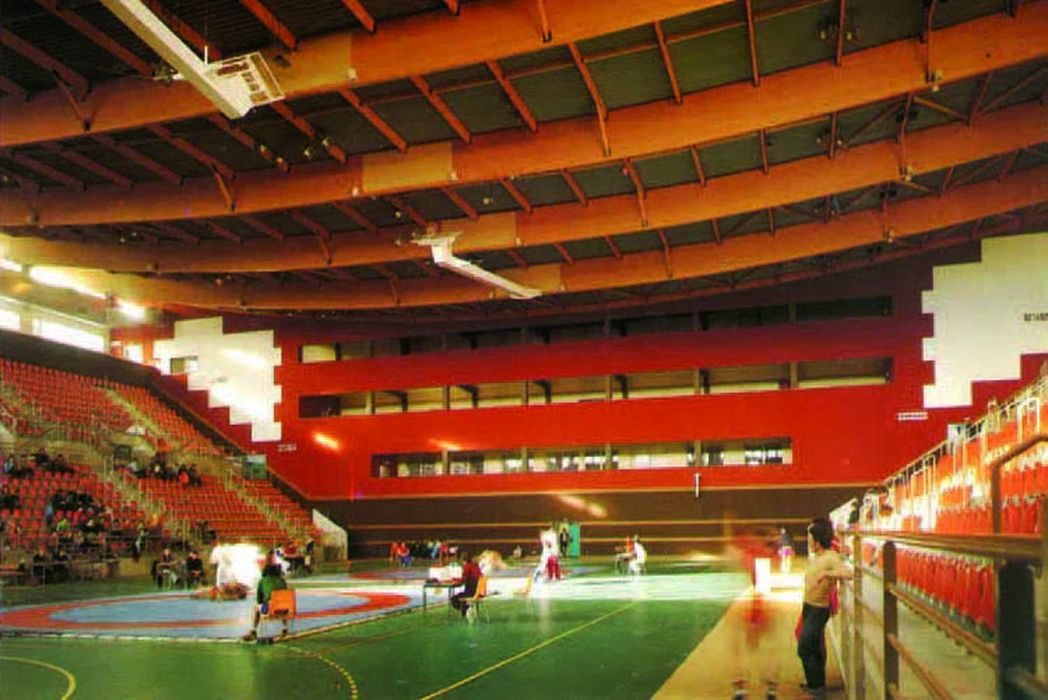 Reposant sur une ossature en béton armé laissée apparente, le bâtiment est édifié sur un plan carré comprenant une grande salle centrale polyvalente (équipée de gradins) en rez-de-chaussée, des salles d’entraînement au niveau du sous-sol et des locaux administratifs ainsi que des salles de réunion dans les étages. Les façades, brut de décoffrage, confèrent à l’ensemble son caractère plastique, et sont rythmées par des brise-soleil en béton formant une grille encadrant les ouvertures, et par des grands pilastres en relief, offrant un aspect sculptural et monumental au bâtiment. L’aménagement de la salle principale se distingue par son imposante charpente en bois lamellé-collé qui s’étend sur 76 mètres, suivant une ligne incurvée constituée d’un assemblage en chaînette, dispositif qui produit en façade un jeu de lignes et de volumes concaves au niveau de la toiture.