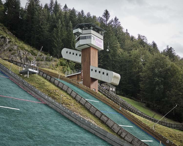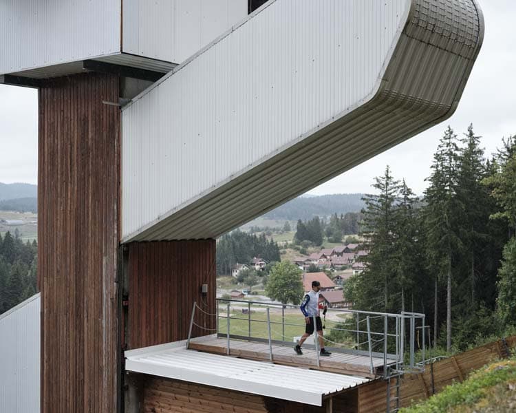 Affirmant clairement sa fonction, cet édifice offre un exemple original de tour de juge dédiée à la compétition du saut à ski. A l’instar d’autres constructions de ce type, comme celle du tremplin du Grépon à Chamonix, elle s’inscrit dans la tradition des tours d’observation. Sa silhouette d’arbre stylisé, l’utilisation du bois en façade, l’inclinaison des cabines reproduisant le dénivelé de la piste, assurent son insertion dans le site.