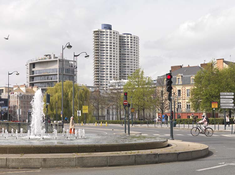 L'immeuble d'habitation Les Horizons est construit en 1970 par l'architecte Georges Maillols, chargé de la rénovation urbaine du faubourg de la rue de Brest, qui devient alors le nouveau quartier de Bourg-L'Evêque. L'édifice, de 100 m de haut, s'élève sur trente étages à partir d'un rez-de-chaussée fortement surélevé sur pilotis, en raison des risques d'inondation. Il est formé de deux tours accolées, à noyau ovale en béton, appuyées également sur une structure extérieure de quatorze poteaux en béton armé et des planchers en dalles pleines. Les techniques employées ont permis une construction rapide, au rythme d'un niveau par semaine. Les façades sont constituées d'éléments de 4,40 sur 2,30 m aux formes ondulées réalisés par le Société rennaise de préfabrication en ciment blanc et quartz concassé. Ces panneaux, adaptés à la taille des appartements et percés d'une embrasure ovoïde, donnent ainsi une silhouette alvéolée à l'édifice. Les tours des Horizons accueillent un millier d'habitants dans 480 appartements de type F2 prévus pour des jeunes couples ou des étudiants. Les appartements placés aux extrémités des tours et à la jonction de celles-ci disposent de balcons, également préfabriqués en ciment blanc. Les circulations verticales sont contenues dans les noyaux des édifices. L'architecte prévoit aussi 440 places de stationnement semi-enterrées dans un espace circulaire au pied du bâtiment. Les Horizons, devenus un des symboles de la ville, sont caractérisés par leur auteur comme un " témoin légitime de l'urbanisme contemporain.