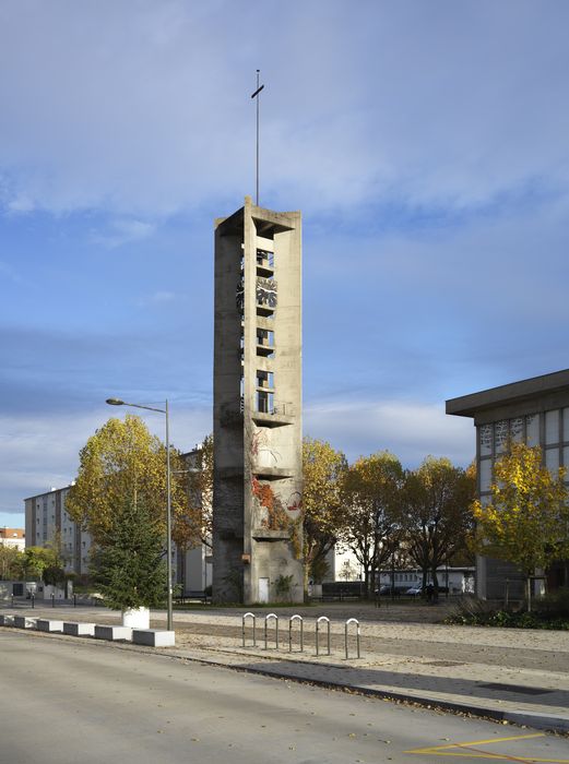 L’église Saint-Vincent-de-Paul et sa tour clocher sont édifées sur le côté est de la place de l’Île-de-France. Un parc est aménagé à l’arrière du bâtiment. Le plan rectangulaire de l’église comprend le chœur, la nef et les transepts englobés dans un volume à toit plat de 25 x 49 mètres, sur une hauteur de 17 mètres. Le clocher, isolé du bâtiment, et formé d’une tour ajourée de 28 mètres surmontée d’une croix. L’église Saint-Vincent-de-Paul et la tour clocher sont construites en béton armé. Toutes les façades de l’église sont remplies, en partie supérieure, de verrières de Léon Zack évoquant des nuages, incrustées entre les poteaux et poutres de la structure. L’église est précédée d’un porche par lequel on pénètre dans la partie basse de l’édifice formant narthex et recueillant la cuve baptismale. La porte en bois ouvrant le rez-de-chaussée confère un caractère monumental à l’entrée. Le rez-de-chaussée abrite la sacristie, une chapelle, et des dépendances. De larges gradins conduisent à la partie haute, assurant la liaison entre les deux volumes et l’unité de l’ensemble. L’église de 1 000 places occupe l’étage sous la charpente en béton armé apparente. Le plafond, réalisé avec des éléments en ciment, contraste par sa couleur sombre et son décor sculpté avec la blancheur et la sobriété des autres parties de l’édifice. Prenant la forme d’un rectangle allongé s’avançant dans la nef, le long podium de marbre blanc situé au milieu laisse sur les deux côtés deux larges allées occupées par des bancs et l’orgue. Le podium supporte un autel monolithique dont les faces ont été sculptées par Maxime Adam-Tessier. L’espace situé à l’arrière de l’assemblée semble avoir été conçu initialement pour accueillir l’orgue et la chorale. Cet espace constitue aujourd’hui un espace de stockage. Les vitraux en dalle de verre de Léon Zack s’étalent comme une vaste fresque lumineuse jouant librement sur les parois de l’église auxquelles elles donnent l’aspect d’une châsse. Ces vitraux rappellent ceux de l’église de Sausheim de l’église Saint-Christophe (Polygone, Strasbourg).